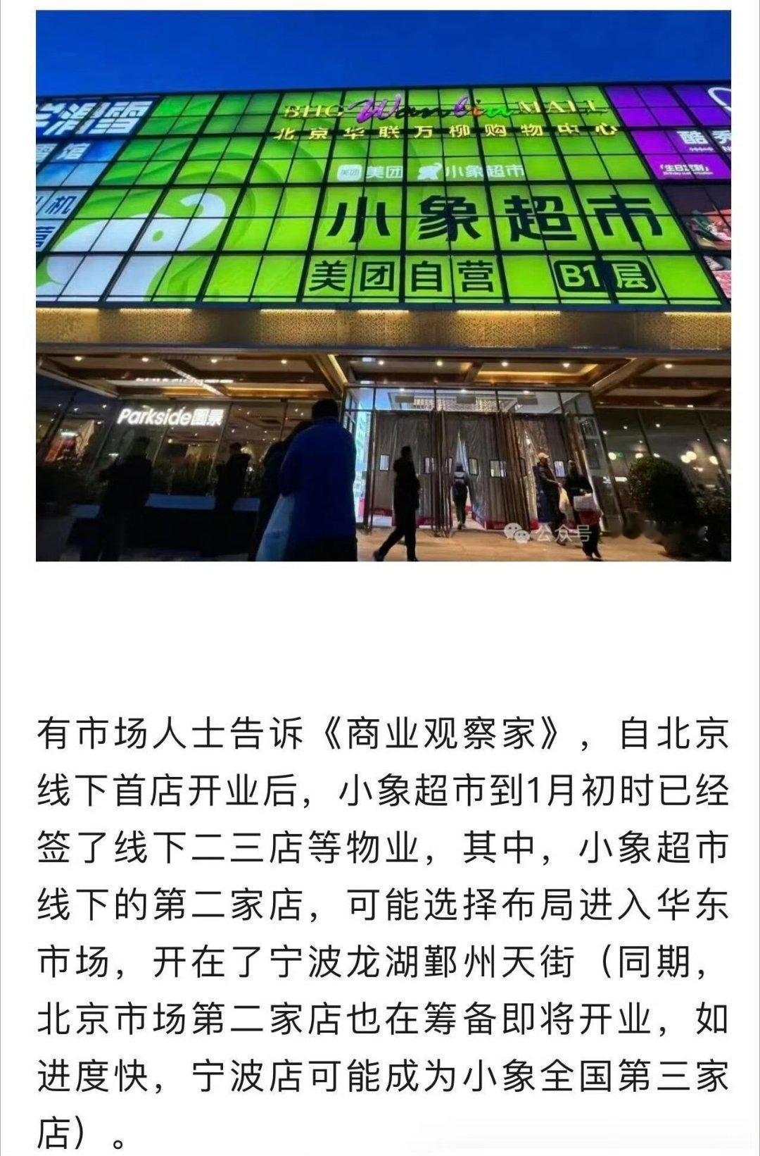 没了宜家来了小象超市华东首店确定在宁波 卧卧卧…美团小象超市华东首店🤩选址宁波‼️阿拉宁波真是越来越厉害了😎你们知道美团的小象超市吗前不久刚在北京开了全国第一家门店火爆全网🔥你们猜第二家店美团选了哪个城市?宁波!!!是阿拉宁波!!!鄞州龙湖天街已经官宣了!!!小象超市线下旗舰店华东首店来啦!!!我发现地图上已经能搜到定位嘞虽然开业时间没定但感觉应该很快就能逛上了🤩附近居民说小区已被“小绿人”包围天天被问“注册一下吗”代入感太强😂已经开始笑了hhh没了宜家来了小象宁波人又多一个地方可以逛咧蹲蹲开业时间到时候一起去打卡呀😁寻美浙江寻美中国