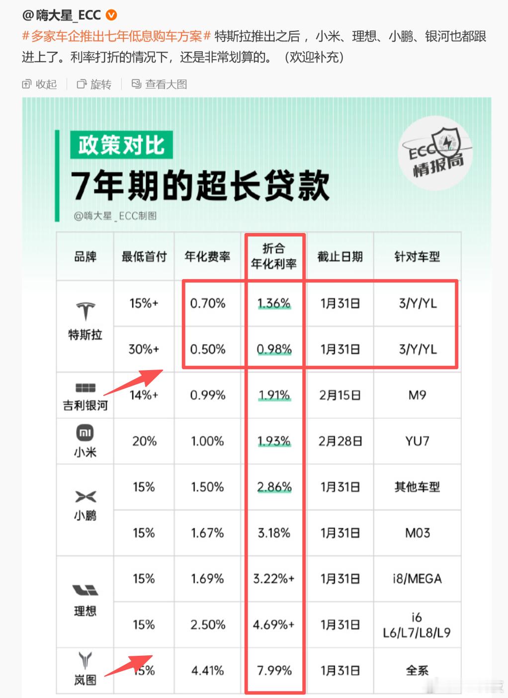关于汽车7年期超长贷说下个人看法:1.不适合经常换车的朋友,仔细想想自己一辆车能开七年吗?2.其次,问清楚年化利率,现在连房贷都下探到3个点了,消费贷下探到2.5附近,严格意义上来说车贷的年化利率合理范围在2.5左右,再高就不太能叫低息车贷3.不要硬上,7年会发生很多很多变化,何况新能源汽车更新迭代极快。。。大家自行把握好~ 多家车企推出7年低息购车