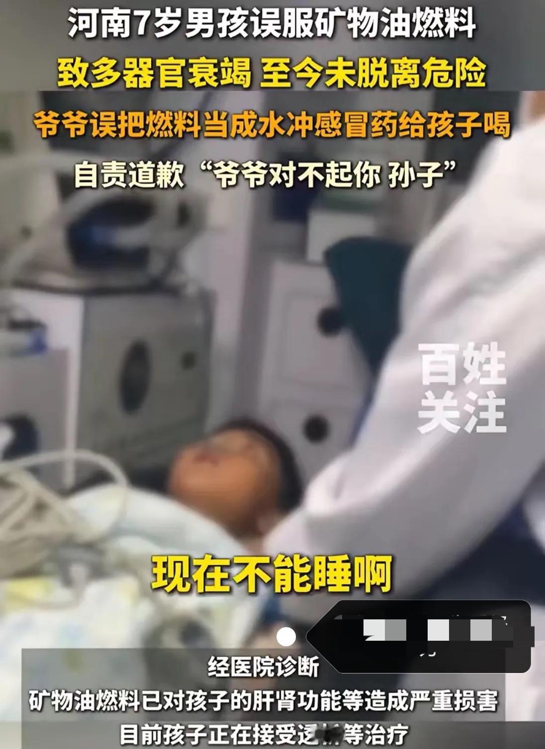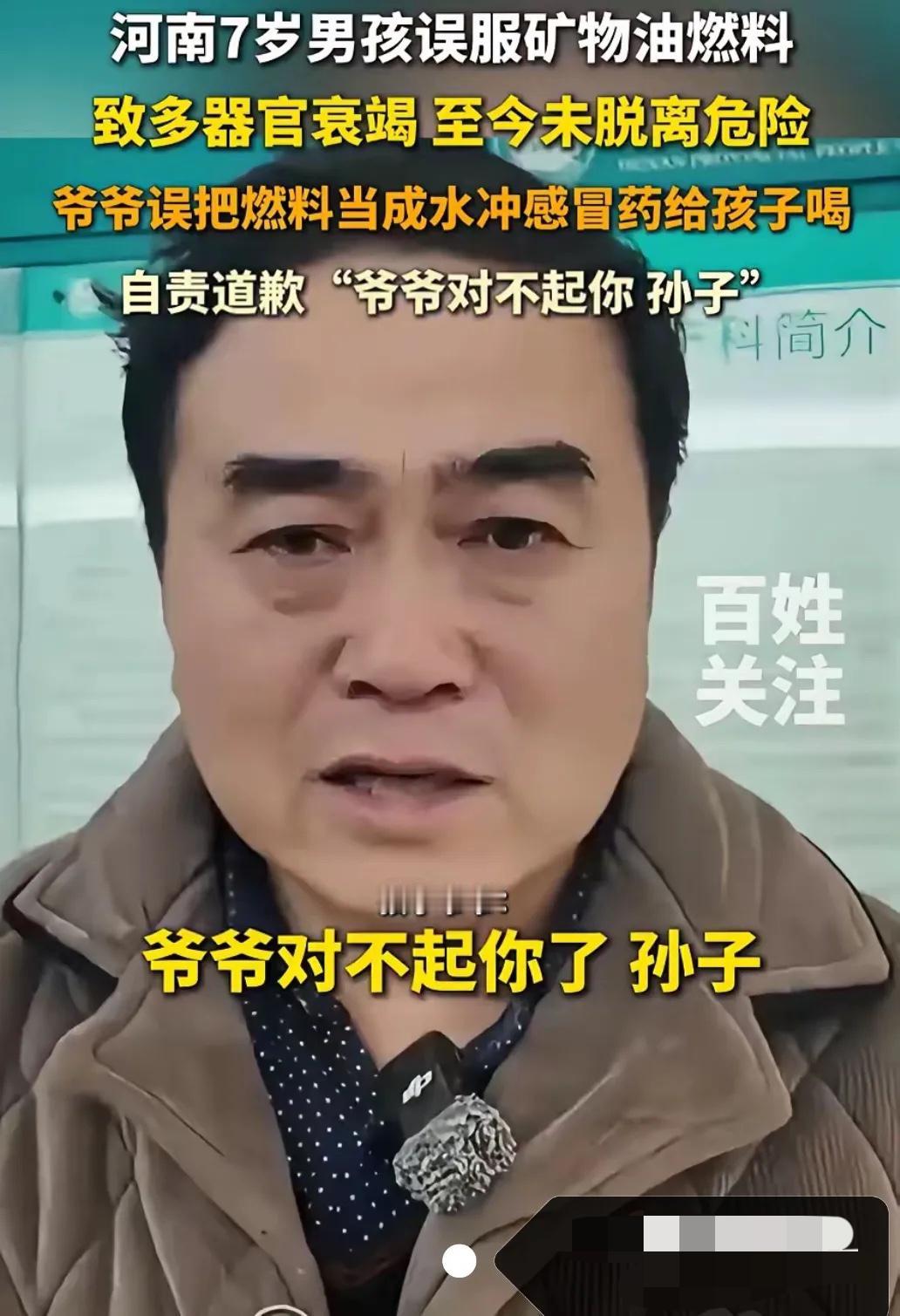 后悔死了!! “天都塌了!”河南郑州,一名7岁男孩感冒生病,爷爷就用矿泉水瓶里的水给孩子冲药喝,可孩子喝了一口就发现不对劲,随后更是呕吐不止,神志不清,爷爷打电话问孩子爸爸,才知道里面根本不是矿泉水,而是矿物油燃料! 孩子爸爸赶回家时,孩子已经脸色发白,嘴唇发紫,抱着怀里滚烫又虚弱的小身子,他手脚都在抖。 邻居帮忙打了120,救护车鸣笛声在小区里划破平静,楼道里满是慌乱的脚步声。 爷爷蹲在门口捶胸顿足,嘴里反复念叨“都怪我”,眼神里满是自责和恐惧。 有人说爷爷太粗心,危险品怎么能装矿泉水瓶,也有人心疼老人不是故意的。 救护车上,医生紧急给孩子做急救,爸爸紧紧攥着孩子的小手,不敢松开。 小区里的邻居都围在楼下,纷纷祈祷孩子能平安无事。 谁也没想到,一个无心的存放习惯,竟差点酿成无法挽回的悲剧。 这场意外,让不少家长警醒,危险品存放真的不能马虎。