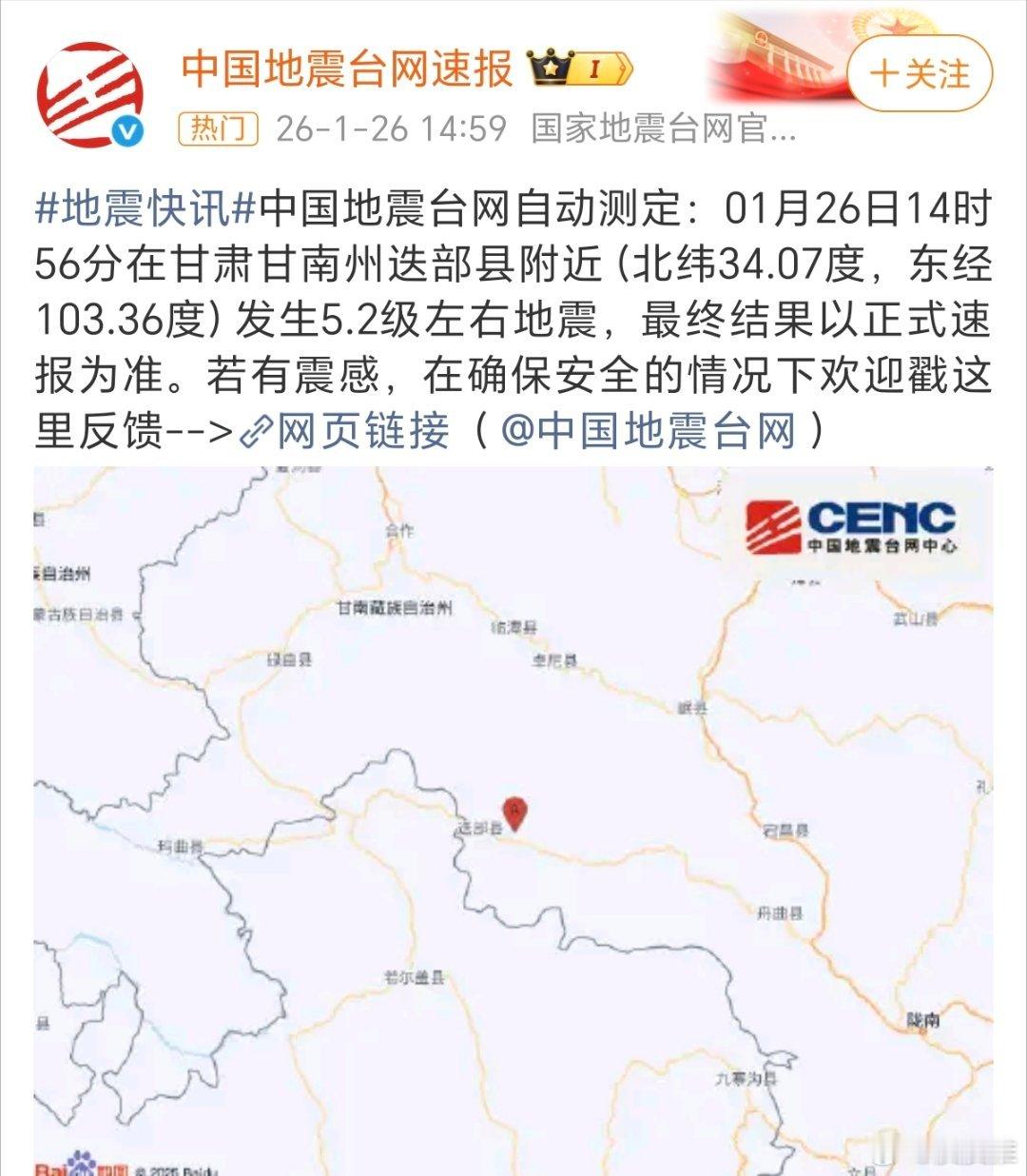 据中国地震台网,01月26日14时56分在甘肃甘南州迭部县附近(北纬34.07度,东经103.36度)发生5.2级左右地震。