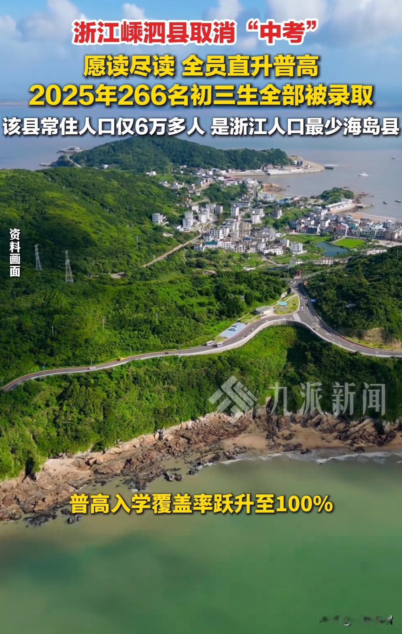 浙江这个县的孩子太幸福了,竟然不用中考,直接上高中。这个县就是浙江舟山的嵊泗县。 这个县常住人口仅6万多人,是浙江人口最少的海岛县。 据悉,2025年,该县全县仅266人填报普高,普高录取率100%。 该举措为了弱化海岛小县教育资源配置难题,实现“应读尽读”。该县今年实现7名学生回流。 对于嵊泗县推出的这项教育政策,大家怎么看?欢迎评论区聊聊。 (图片来源网络)