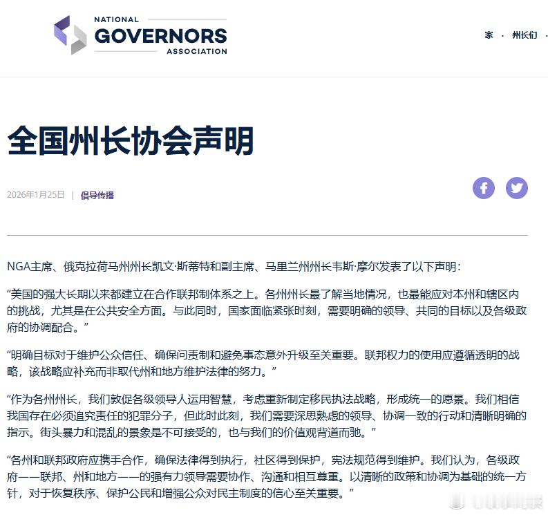 【全美州长协会声明】[两党本质上是一伙的,割韭菜为各自牟利,但底线是一致的:维护“价值观”和政权](官网)美国州长协会NGA主席、俄克拉荷马州州长凯文·斯蒂特和副主席、马里兰州州长韦斯·摩尔发表了以下声明:“美国的强大长期以来都建立在合作联邦制体系之上。各州州长最了解当地情况,也最能应对本州和辖区内的挑战,尤其是在公共安全方面。与此同时,国家面临紧张时刻,需要明确的领导、共同的目标以及各级政府的协调配合。”“明确目标对于维护公众信任、确保问责制和避免事态意外升级至关重要。联邦权力的使用应遵循透明的战略,该战略应补充而非取代州和地方维护法律的努力。”“作为各州州长,我们敦促各级领导人运用智慧,考虑重新制定移民执法战略,形成统一的愿景。我们相信我国存在必须追究责任的犯罪分子,但此时此刻,我们需要深思熟虑的领导、协调一致的行动和清晰明确的指示。街头暴力和混乱的景象是不可接受的,也与我们的价值观背道而驰。”“各州和联邦政府应携手合作,确保法律得到执行,社区得到保护,宪法规范得到维护。我们认为,各级政府——联邦、州和地方——的强有力领导需要协作、沟通和相互尊重。以清晰的政策和协调为基础的统一方针,对于恢复秩序、保护公民和增强公众对民主制度的信心至关重要。”