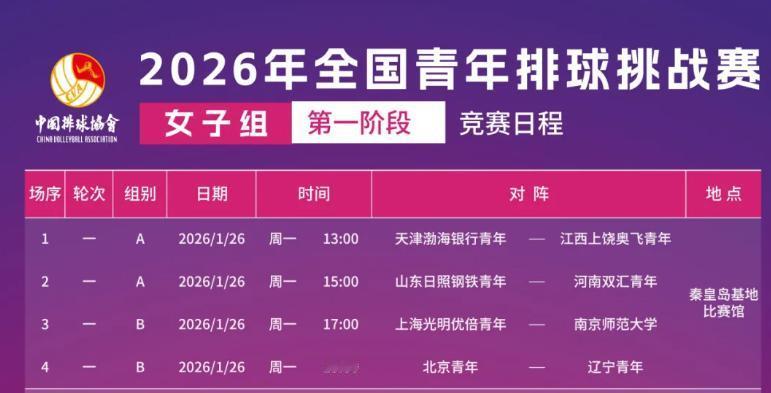 【1月26日全国青年排球挑战赛拉开战幕】 2026全国青年排球挑战赛拉开战幕! 一共有19支青年队+3支高水平大学队参赛 秦皇岛、上饶、江门、启东四城联动 男子组12支队第一阶段 在江西上饶体育中心展开厮杀 女子组10支队第一阶段 在秦皇岛训练基地互相扯头花~ 据悉南师大女排主教练陈展得去做裁判 前中国女排队长惠若琪会加入到教练组 19:00 女子组北京PK辽宁 得空瞅瞅辽宁那么多小飞侠到底真假~ 观赛渠道:中国排协微博全程直播