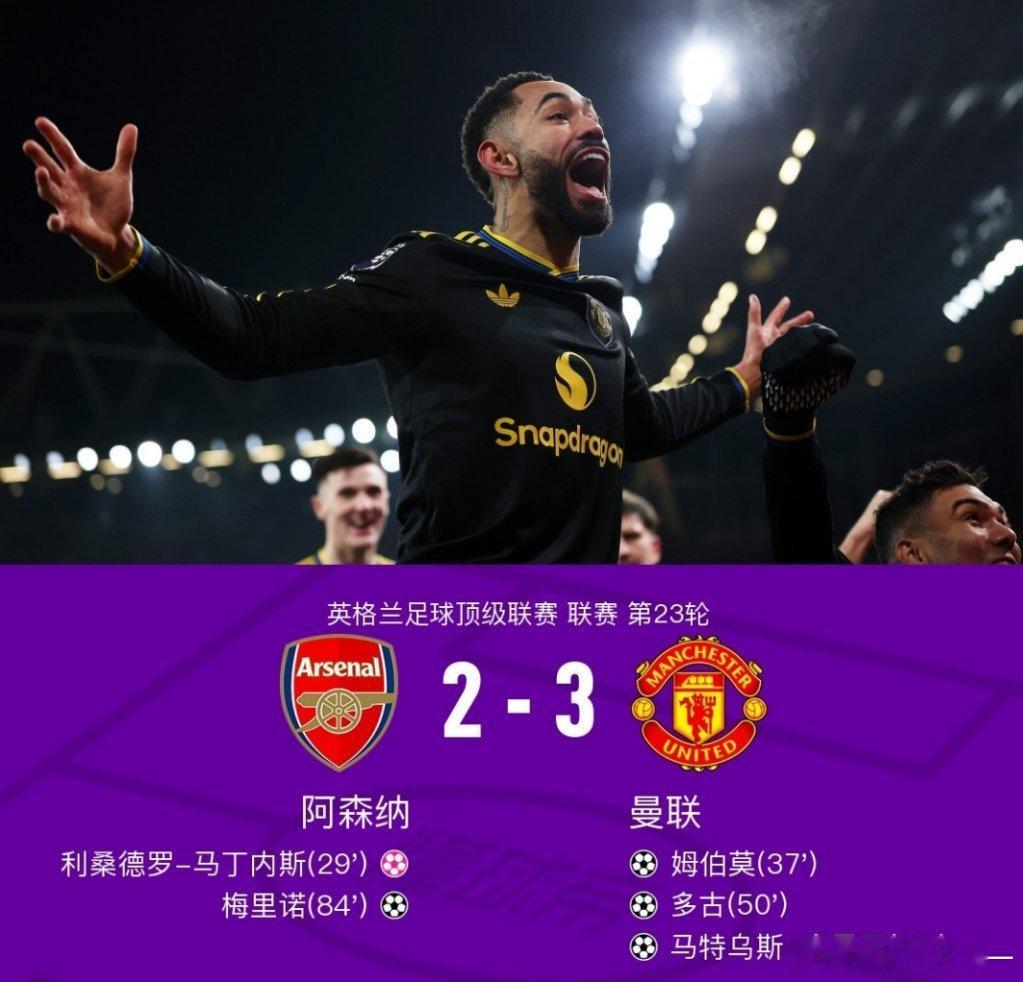 阿森纳2比3曼联英格兰足球超级联赛第23轮,阿森纳主场对阵曼联。上半场,厄德高制造利马乌龙。苏比门迪送出乌龙助攻,姆伯莫扳平比分。下半场,多古轰入无解世界波,梅里诺利用角球机会扳平比分。不过,库尼亚很快再次轰入世界波。全场比赛结束,曼联客场3-2击败阿森纳,拿下两连胜。足球