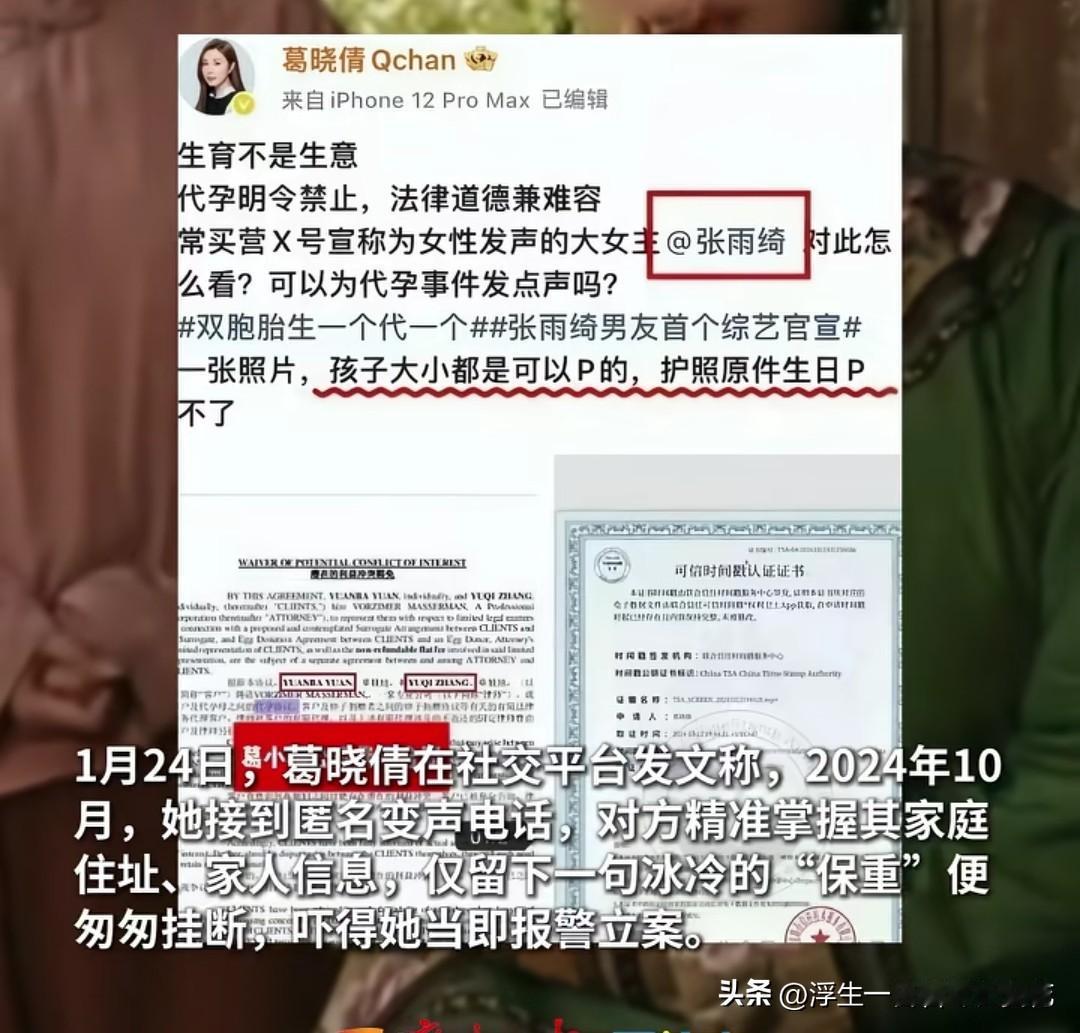 张雨绮可能要塌房了,而且将不会出现在辽宁春晚舞台。葛晓倩称2016年她与袁巴元尚未离婚时,通过家中监控发现张雨绮频繁出入其共同住所,且行李上的登机标签显示名字为“yuqi zhang”,由此直指张雨绮插足自己的婚姻。 后来葛晓倩发文暗指张雨绮存在代孕行为,她晒出经公证的护照信息,显示张雨绮两名子女出生日期仅间隔3个月,不符合正常妊娠周期。随后张雨绮晒孕照辟谣时并未解释这一矛盾。 之后葛晓倩接到了匿名变声电话,对方掌握其家庭地址及家人信息并进行威胁,她随即报警。时隔一年后,警方调查结果显示威胁者为孙姓、范姓两名律师,目前两人已向葛晓倩道歉。 若后续代孕、插足指控被证实,或律师威胁事件牵连到其本人及团队,她的公众形象和商业价值可能会面临崩盘。张雨绮面临的可能会跟郑爽一样的结局,将全面封杀。