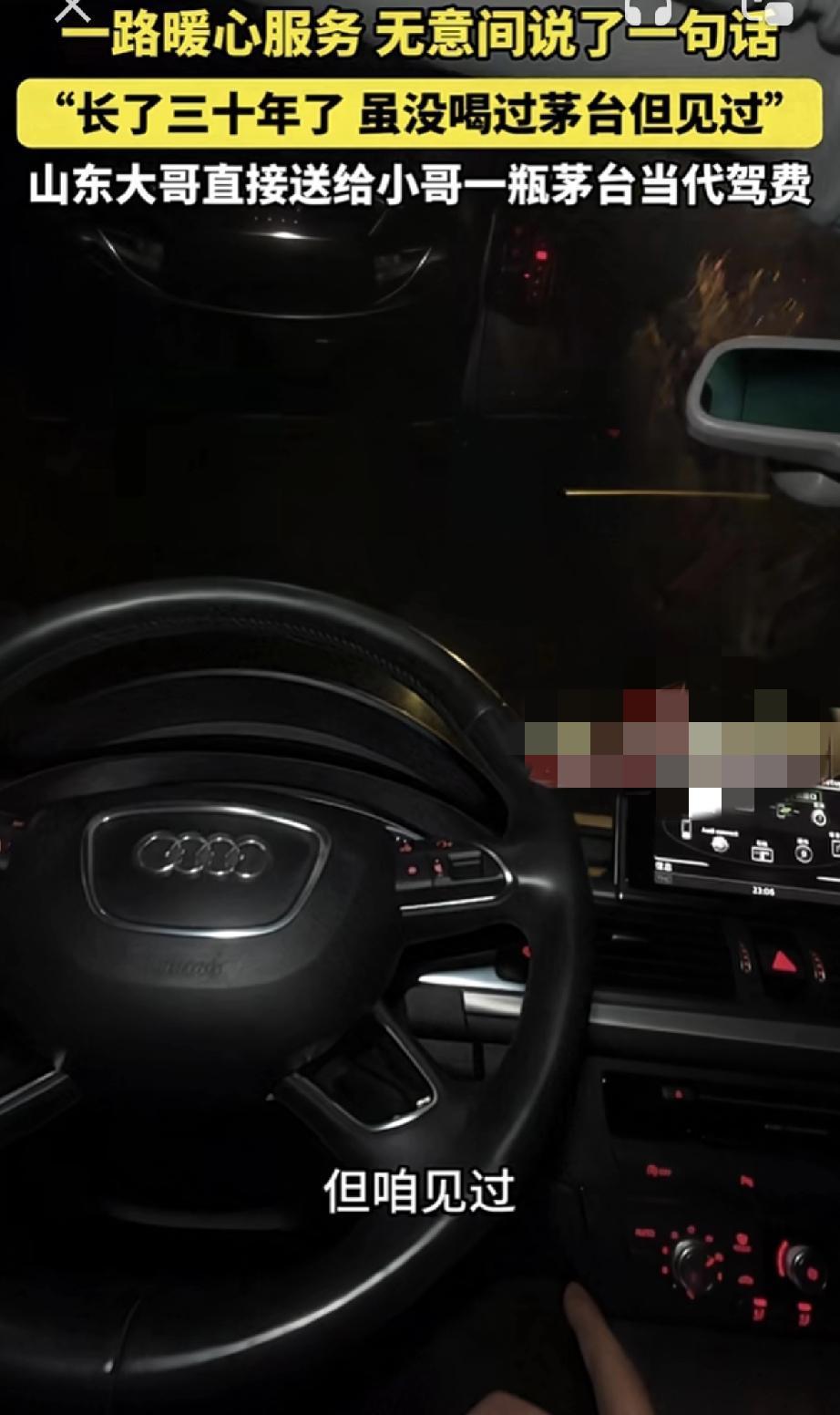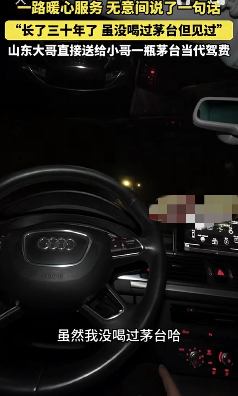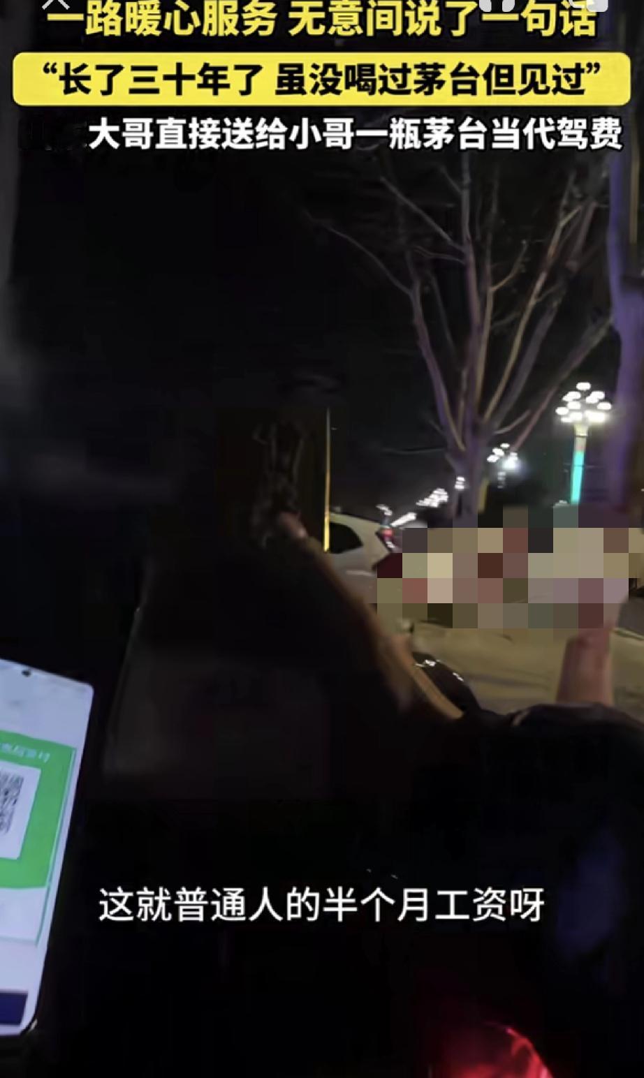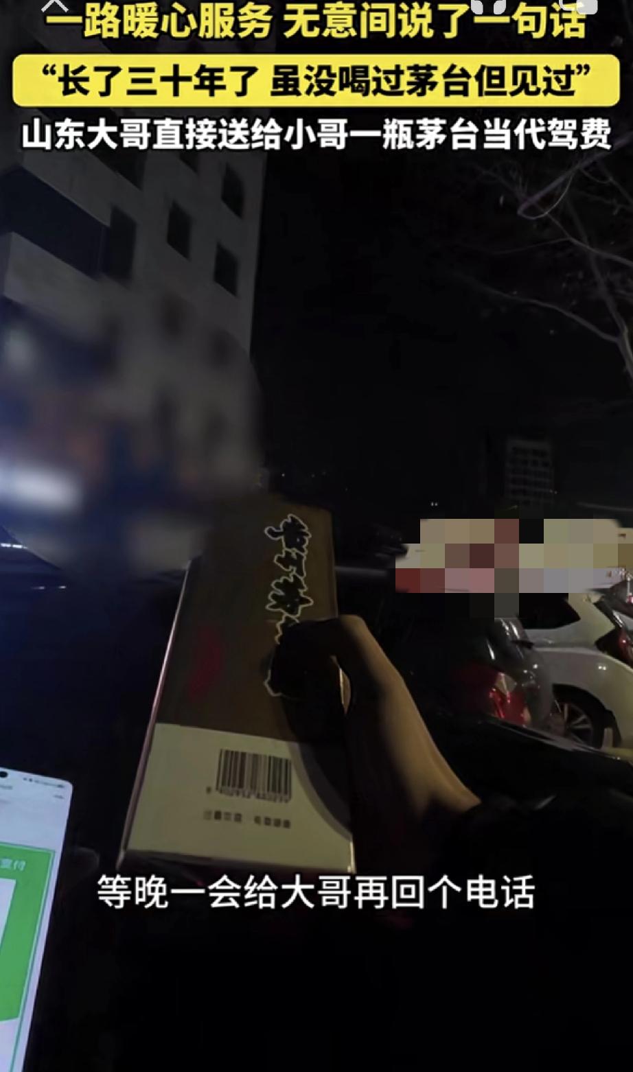 山东聊城,代驾小哥接了一单代驾,一路小哥暖心为雇主服务,聊天时小哥则无意间说了一句话“长了30年,虽没喝过茅台,但见过”。正是这一句话,雇主铭记于心,到达目的地后,雇主便直接送给小哥一瓶茅台当代驾费。 视频可见,小哥接单后,就发现雇主喝多了,并暖心的为雇主递上一瓶酸奶,暖胃醒酒,车开到半路时,雇主又因胃不舒服下车吐了出来。 此时小哥也没闲着,而是赶紧跑到附近商店,为雇主买了水和火腿肠。雇主吐完后,小哥又体贴的将水和火腿肠拿给雇主。 随即雇主缓过神后,小哥继续拉着雇主前往目的地。期间小哥就和雇主闲聊道:哥今天喝的是酱香茅台吧,好大的酱香味。 雇主则表示“兄弟连着都闻出来了”,小哥接着说道“长了30年,虽没喝过茅台,但还是见过,哈哈”。正是这随口一句,雇主便听进了心里。 而等到达目的地后,雇主下车便打开后备箱开始翻找东西,并对着小哥说道“代驾钱我就不给你了”。 此话一出,小哥以为是雇主喝大了不想给钱,紧接着雇主便拿出一瓶茅台,对小哥说道:你拿瓶这个尝尝,就当抵代驾费了。 雇主这突如其来的举动,也让小哥瞬间愣住了,缓过神后小哥才赶紧拒绝雇主,但此时雇主已将茅台塞到了小哥怀里,转身就走了。 对此小哥表示,怎么也没有想到,做个代驾居然还能收瓶茅台,简直想都不敢想! 而看着这差不多普通人半个月工资的茅台,小哥觉得自己遇到了一个有格局的人。但小哥还是决定,等会再给雇主大哥打个电话,看是不是他喝醉了才送的茅台。 不得不说,代驾小哥这真是遇到一个好雇主,这几千块钱的配送费,谁拿到不开心呀!但话说回来,要不是小哥如此周到暖心的服务,恐怕也得不到这意外之喜吧。所以这做人做事,真诚以待太重要了! 对此大家怎么看?