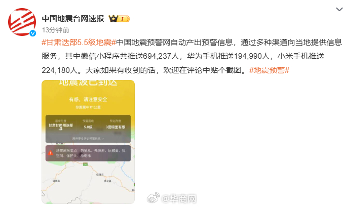 【#超69万人收到地震预警#】中国地震预警网自动产出预警信息,通过多种渠道向当地提供信息服务,其中微信小程序共推送694,237人,华为手机推送194,990人,小米手机推送224,180人。#甘肃地震##甘肃迭部5.5级地震#