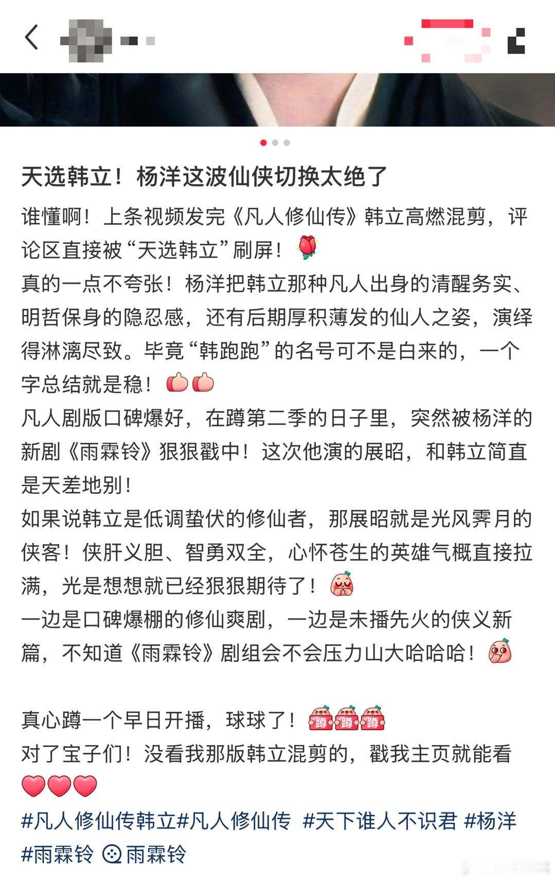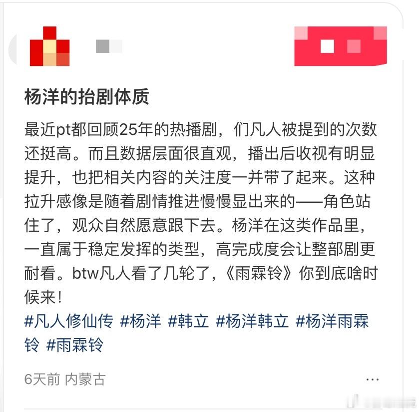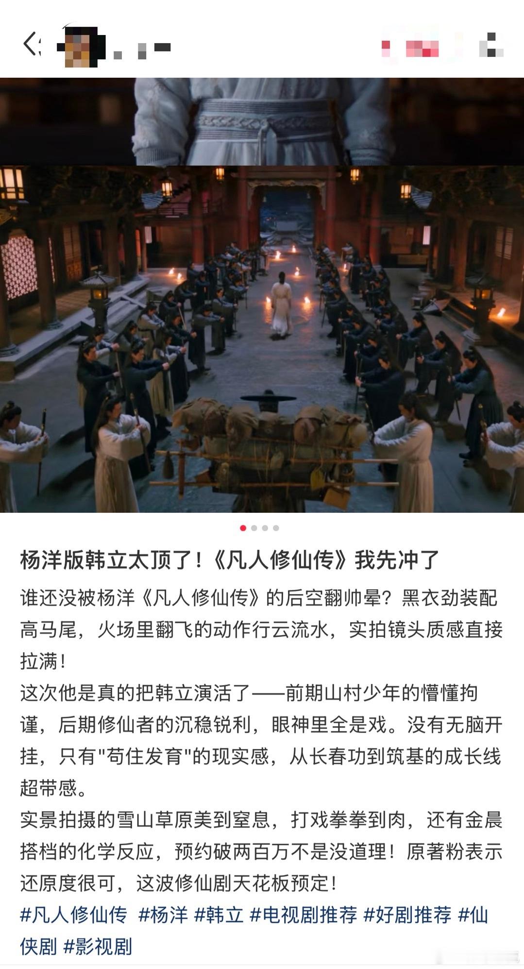 杨洋韩立火灵根还在发力 谁能拒绝杨洋演的韩立啊,把角色的隐忍和坚韧都刻进骨子里了,凡人修仙传能拿下年度IP改编剧集,杨洋的演绎绝对是一大关键,年底盘点全是好评太提气