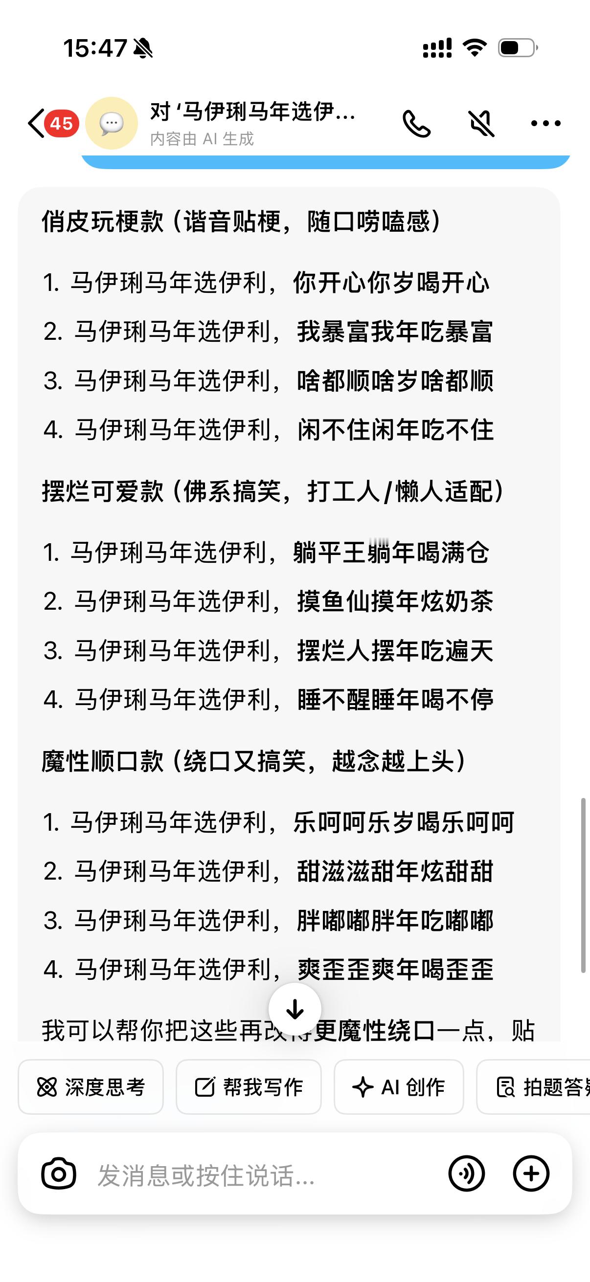 马伊琍马年选伊利 伊利这个代言人选的好啊,马年选马伊俐,神来之笔。伊利还搞了对春联、对下联的活动,上联是「马伊琍马年选伊利」,我用AI整了几个年轻人版的下联,「摆烂人摆年吃遍天」大伙瞅瞅咋样?各位铁铁展示才华的时候到了,让我我看看大家的水平如何👀
