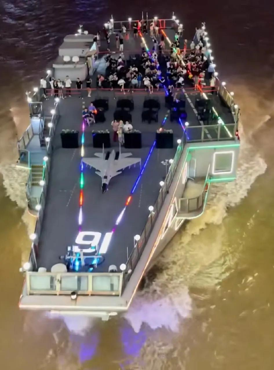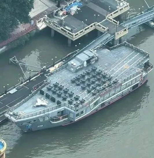 这艘小航母绝对是军舰模仿界的扛把子!船头硕大的“16”舷号,让军迷一眼便认出它的模仿本尊——威武霸气的辽宁舰! 该船名曰蓝海豚16号,是一艘航行在广州珠江里的辽宁舰主题观光游船,甲板宽大平整,上面摆放几十张餐桌,供军迷们消闲用餐,也算小小实现了军迷们登上辽宁舰的愿望! 再细观之,船头的飞机,竟然不是歼15、歼16等舰载机,而是享誉世界的10爷?!也算是小小弥补了10爷登不上航母的遗憾![捂脸]