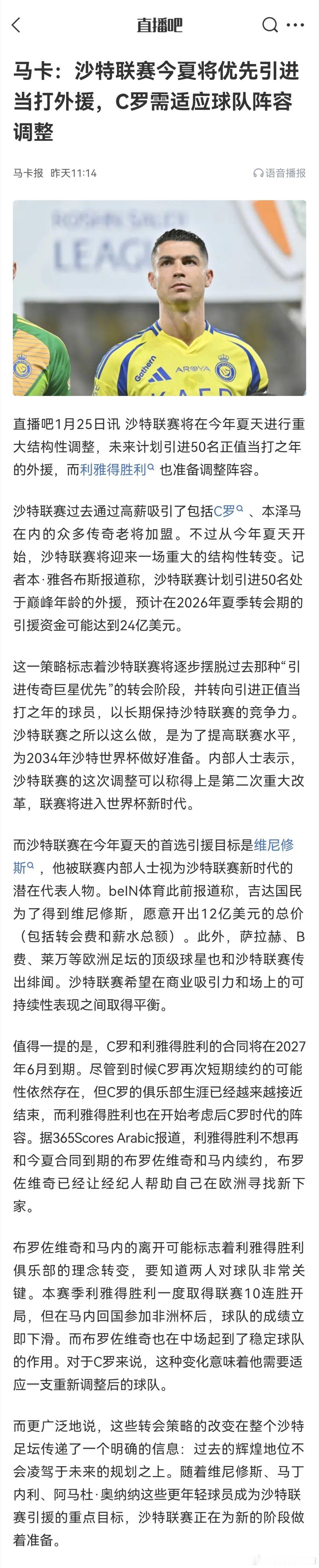 C罗 完全不看好后C罗时代以沙特本土举办的赛事为基准,首先 C 罗目前的影响力至少还能辐射到 2027 年亚洲杯。原定 2029 的亚冬会因 Neom 项目未完成而无限推迟,直到 2034 亚运会和 2034 世界杯还有7年的空窗期。沙特联赛主要得解决 C 罗退役后7年空窗期的发展。而且沙特从前两年开始已经进入了买当打球员的阶段了,购买修斯,萨拉赫等人的商业号召力不用说太多,但撑到 2034 世界杯宣传期时间太长了。还有这些个 12 亿夸张的数字看看就行,这种数字和当时梅西的宣传差不多,是欧洲卖货的目的罢了。沙特若真想搞好后 C 罗时代,只需要好好招待好 C 罗就行,提升退役后 C 罗待遇,让罗哥持续宣传,这是最省钱且省力的方式,比真花钱乱砸人好多了,因为沙特联赛买欧洲顶级球星肯定是溢价买的。稳定并提升沙特联赛唯有时间的慢慢沉淀和良好的经营,最后深化沙特本土足球的氛围才是最好的方式。