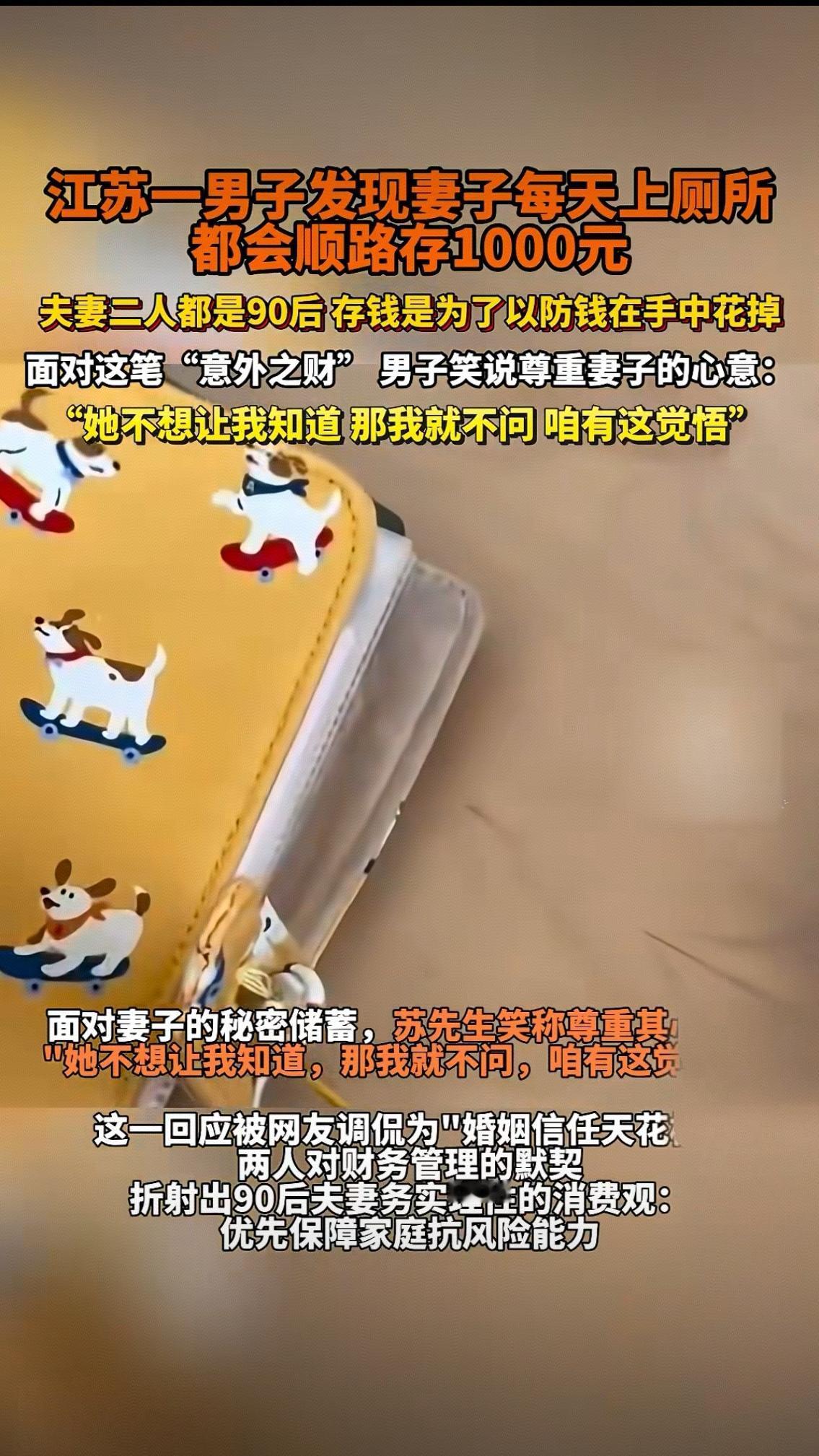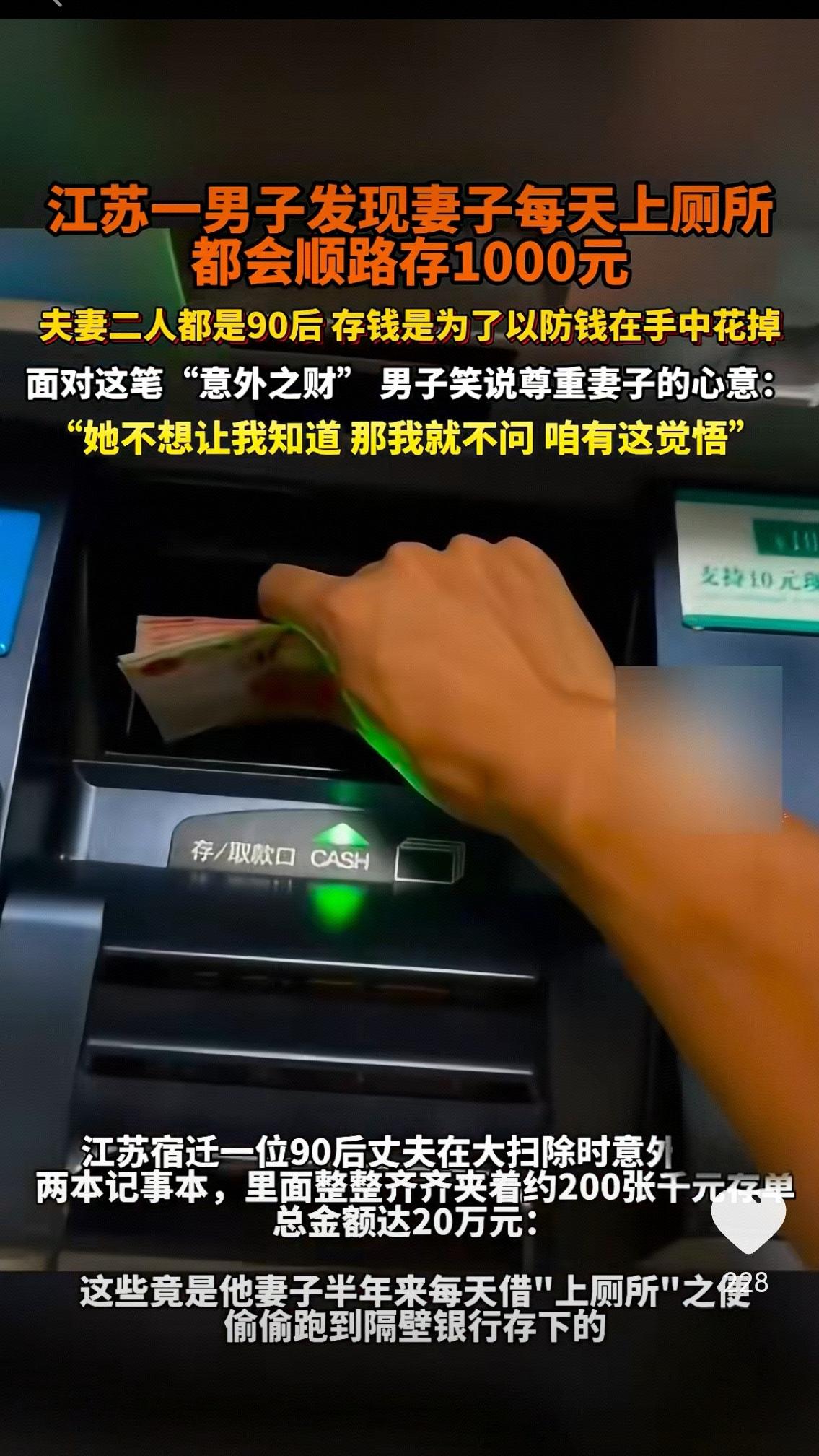 “意外之财”…苏先生翻到那两本泛黄记事本时,原本只是想顺手整理杂物,可指尖触到内里厚实的质感,翻开瞬间直接愣在原地——不是密密麻麻的文字,而是一沓沓整齐码放的银行存单,每张面额都是1000元,顺着页码往下数,足足近200张,算下来竟有20万之多。直到这时他才恍然大悟,妻子每天说“上厕所顺路溜达”,原来都是拐去了隔壁银行,从2025年8月起,雷打不动每天为这个家存下一笔底气。 作为个体户夫妻,他俩的收入全靠起早贪黑打拼,没有固定月薪,今天生意旺赚得多,明天行情淡可能颗粒无收,手里攥着现钱时,总忍不住被零碎开销耗掉。妻子没说过一句攒钱的话,却用最实在的行动,把“防手松”刻进了日常。有人或许会问,夫妻间存钱为何要瞒着?其实细想全是烟火气里的细腻——她怕丈夫觉得没必要紧绷,怕两人为攒钱多少起分歧,索性自己悄悄扛下这份坚持,把日子的安全感一点点存进记事本里。 而苏先生那句“她不想让我知道,那我就不问”,更是戳中了无数人对婚姻的期待。没有追问“为啥瞒我”,没有质疑钱的去向,只用一句“咱有这觉悟”,接住了妻子的良苦用心。这哪里是“私房钱”,分明是90后夫妻的相处智慧:我懂你默默付出的温柔,你信我不问不说的包容。比起“查账式婚姻”的紧绷,这种“不必事事说破”的信任留白,才是婚姻最舒服的模样。 要知道,曾有调查显示近九成男士会存私房钱,可大多带着“留自由度”“防尴尬”的私心,而这位妻子的“秘密存钱”,却满是为家打算的赤诚。如今太多人吐槽“攒钱难”,工资到手就被花呗、冲动消费吞噬,可她用“每天1000元”的小额坚持,证明攒钱从不是苦行僧式的委屈,而是把对生活的认真,融进日复一日的小仪式里。 这20万存单背后,藏着的是普通人对抗生活不确定性的勇气,是90后从“月光族”到“家庭担当”的蜕变,更是婚姻里最动人的默契:你悄悄为我们铺路,我稳稳接住你的心意。网友们炸锅的羡慕,说到底是向往这种“心往一处想”的踏实——不是大富大贵,而是有人和你一起,把平凡日子过成稳稳的幸福。你家有哪些攒钱小妙招?遇到这种“意外之财”会怎么做?评论区聊聊生活日记