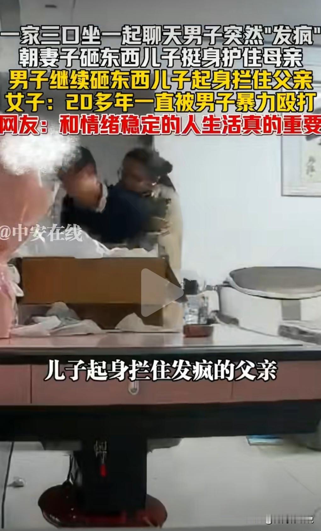 家暴实在是太可怕了。1月25日贵州。一家三口聊天,一子突然情绪失控。 往妻子的身上砸东西。 儿子起身拦住父亲。 令人痛心的是这名女子20年一直被这名家暴男殴打。 遇到这样的环境应该远离,绝对不能够将就,不要和这种情绪不稳定有家暴的男人在一起生活,那真的是太痛苦了。