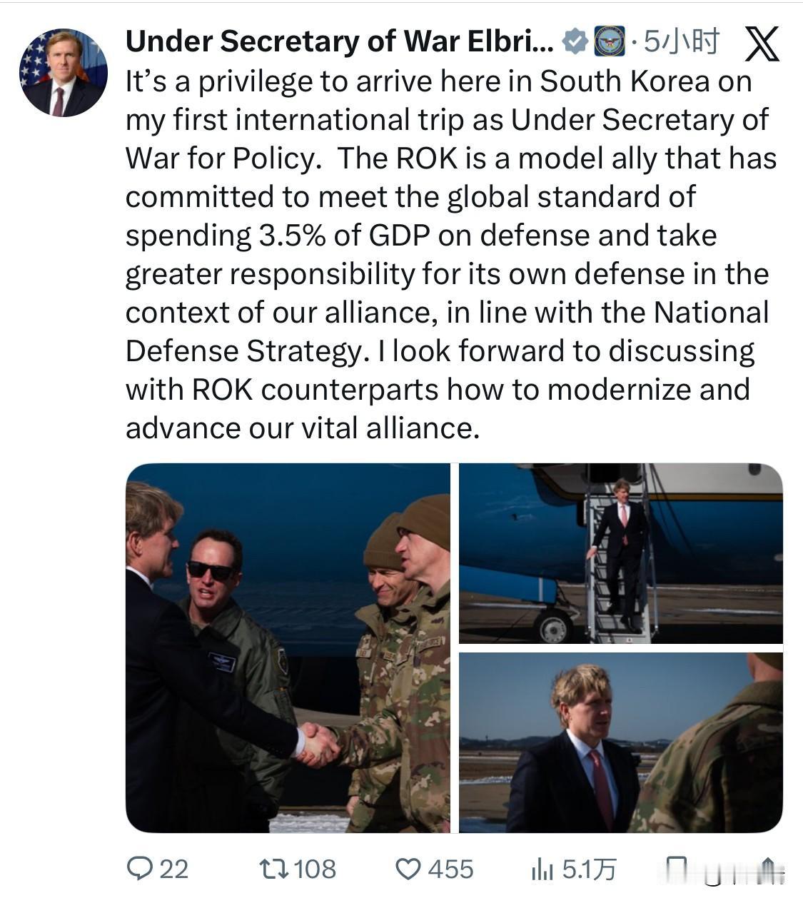 美国国防部政策副部长(Under Secretary of Defense for Policy)埃尔布里奇·科尔比(Elbridge Colby)于 2026年1月25日(周日)抵韩,计划访问至1月27日(周二),随后前往日本。 这是科尔比就任后的首次海外访问。1月26日,他在首尔会见了韩国国防部长官安圭伯(Ahn Gyu-back)和外交部长官赵显(Cho Hyun)。 科尔比称赞韩国是“模范盟友”,对韩国将国防开支提高到GDP 3.5%的承诺表示肯定。 此次访问紧随美国国防部发布《2026年国防战略报告》(NDS)之后,讨论重点围绕“同盟现代化”及角色重组: 防务责任转移: 讨论美国新战略中要求韩国在遏制朝鲜方面承担“首要责任”的方针,而美国将提供更具针对性但相对有限的支持。 核动力潜艇合作: 韩美双方同意加深在韩国研发核动力潜艇方面的合作,这被视为提升韩国自主防卫能力的关键一步。 战时作战指挥权(OPCON): 双方讨论了加快移交进程的必要性,韩方敦促就移交后的后续协调工作进行更紧密的合作。 防卫费分担: 涉及驻韩美军费用的进一步分担和同盟角色的重新调整,以符合美国将重心转向优先保护其本土及应对更广泛印太威胁的战略。