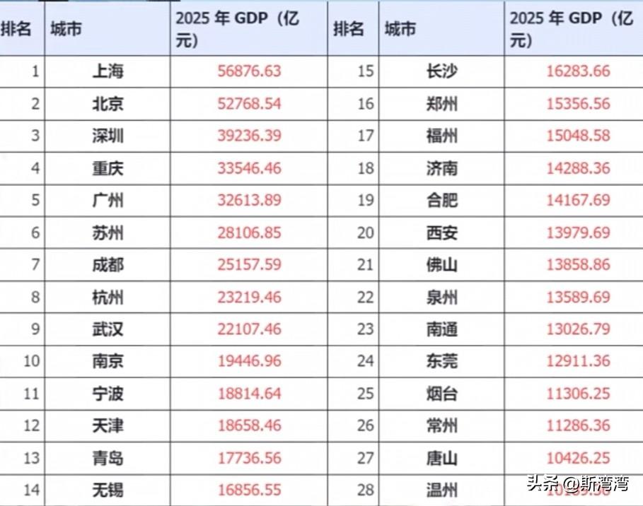 2025年全国GDP十强城市出炉了! 上海和北京遥遥领先,尽管深圳第三,但与第一第二的上海北京差距还不小。 显然,令人遗憾的是整个4万亿元的区间被空置。相信在2026年会出现独特的一幕: 上海独享全年GDP6万亿元人民币 北京独享全年GDP5万亿元人民币 深圳独享全年GDP4万亿元人民币