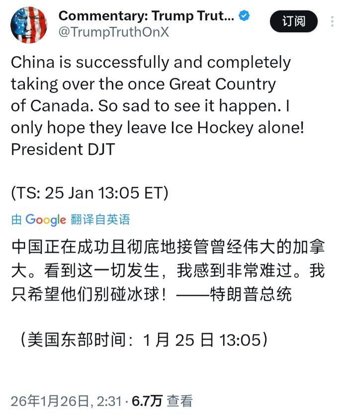 特朗普又开始胡言乱语了!在北京时间1月26日川普发文表示,中国正在成功且彻底地接管曾经伟大的加拿大。看到这一切发生,他感到非常难过,只希望中国别碰冰球! 当地时间1月25日,他在真实社交上发帖,张口就编中国在“彻底接管”加拿大,装出痛心疾首的模样说难受,末了还画蛇添足求中国别碰冰球,这话看着荒唐,实则藏着双标的龌龊心思,自己才是拿捏加拿大的黑手。   先说说这刻意讨好的冰球梗,冰球在加拿大是刻进骨子里的国球,地位比咱们的乒乓球还重,全国大多都是冰球迷,职业联赛的热度碾压其他赛事。   特朗普提这个,就是想装懂加拿大,靠拉拢民粹情绪刷存在感,掩盖自己的真实目的。   “中国接管加拿大”的说法纯属无稽之谈,中加近期关系稳步回暖,双方刚敲定多项经贸合作,全是平等自愿的务实往来,咱们靠合作共赢拓展关系,从来不会搞控制那一套,跟特朗普的臆想完全不沾边。   真正不把加拿大当独立国家的,恰恰是特朗普自己,就在近期的达沃斯论坛上,他公开羞辱加拿大,声称“加拿大之所以存在全靠美国”,还要求对方记住这话,这番言论根本没把盟友的主权放在眼里。   加拿大总理也没惯着他,当场怒怼回去,明确表态加拿大不是靠美国生存,之所以繁荣是因为加拿大人自己的努力,还强调“我们是自己国家的主人,这番硬气回应,赢得了加拿大国内民众的广泛支持。   不少加拿大民众通过社交媒体发声,谴责特朗普的无礼言论,大家都清楚,特朗普眼里根本没有盟友,只有自己的利益,他对加拿大又打又骂,见中加正常合作就眼红心热,造谣抹黑不过是想挑拨关系,把加拿大绑在自己的战车上。   特朗普的操作从来都是一套双标逻辑,对自己的盟友想骂就骂、想压就压,动辄用关税、政治羞辱施压,见别的国家和盟友平等合作,就编造“接管”的谎言泼脏水,本质是见不得别人脱离自己的掌控,霸权思维深入骨髓。   中加合作根本不受这种谣言干扰,两国合作基于各自需求,加拿大需要稳定的合作伙伴带动经济复苏,咱们也需要优质资源助力发展,这种互利共赢的关系,比特朗普的荒唐言论靠谱百倍,也不是几句谣言就能撼动的。   特朗普之所以频繁飙出极端言论,核心还是为了自身政治利益,眼下他需要靠反华、拿捏盟友的话题凝聚选票基本盘,靠制造对立转移国内矛盾,拿中加关系造谣,不过是他选举造势的手段,根本不管会破坏国际合作大局。   加拿大民众和政府都不傻,早就看清了特朗普的真面目,想靠一句冰球梗装亲近,靠谣言挑拨关系,纯属自欺欺人,国际社会的合作大势不可逆,霸权主义的小动作,终究只会沦为世人的笑柄,改变不了平等互利的主流。   国家之间的交往,靠的是尊重与共赢,不是霸权与造谣,特朗普的双标操作,只会让更多国家看清美国的霸权本质,反而加速盟友的离心离德,中加合作会继续稳步推进,任何造谣抹黑,都挡不住互利共赢的时代潮流。 大家对此有什么看法呢?欢迎各位在评论区留言!