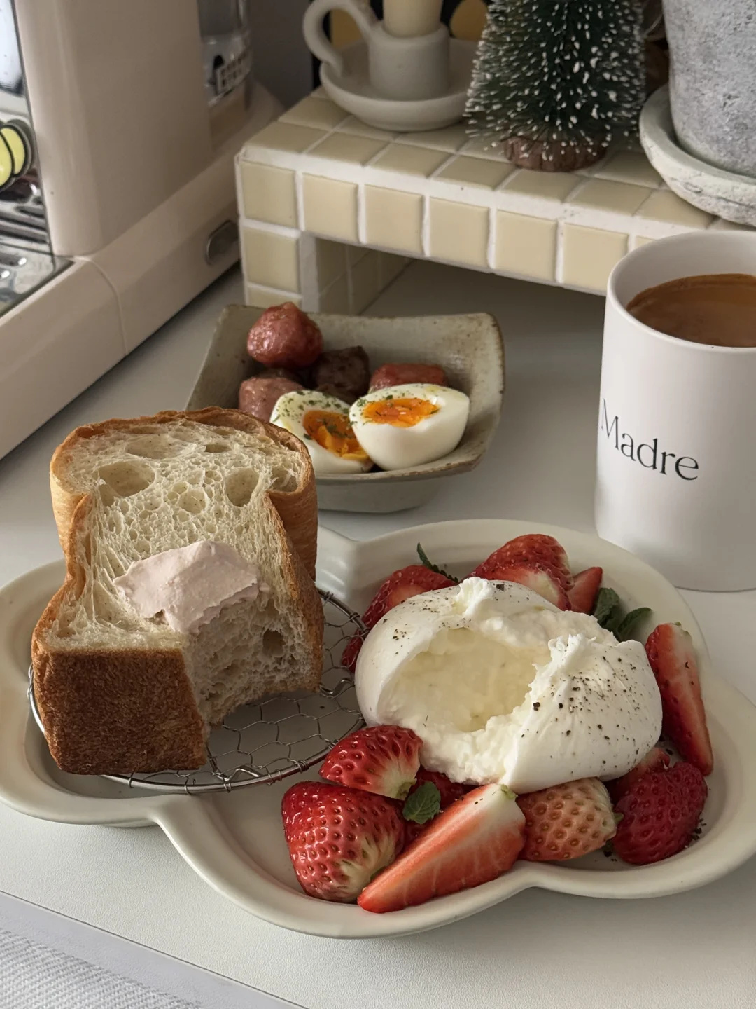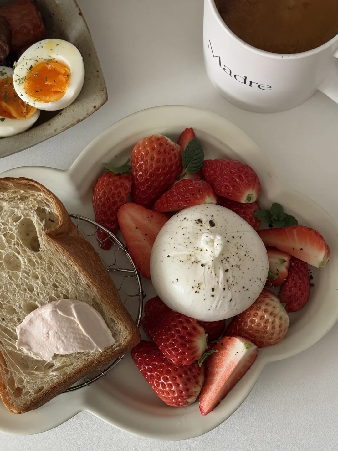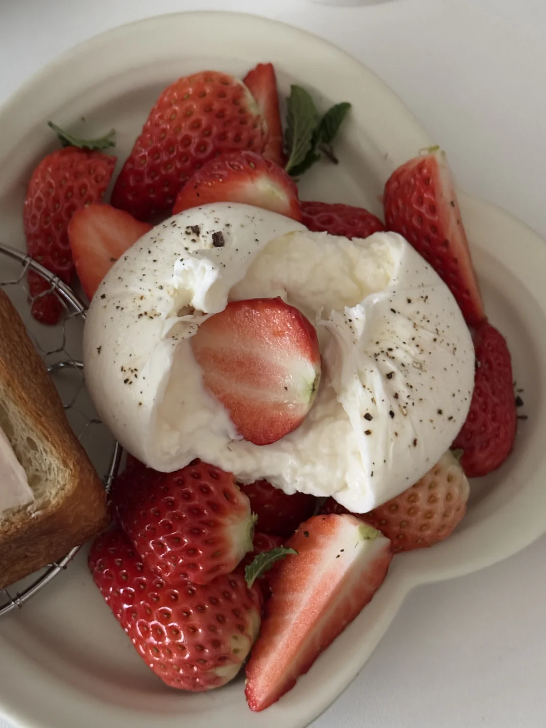 真的有被白草莓的价格震惊到 还是买点红草莓吃吃吧[暗中观察R] - 今日早餐🥣 - ▪️香草吐司|草莓布拉塔🍓|拿铁|烤肠🥚| - 厚切吐司吃着好过瘾 里面的香草籽还嫩嚼到[偷笑R]