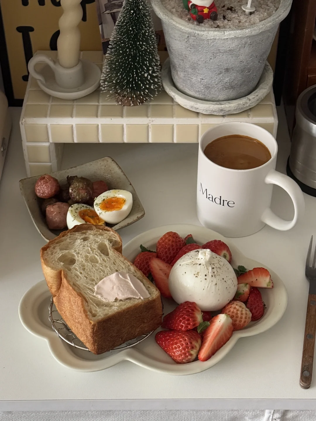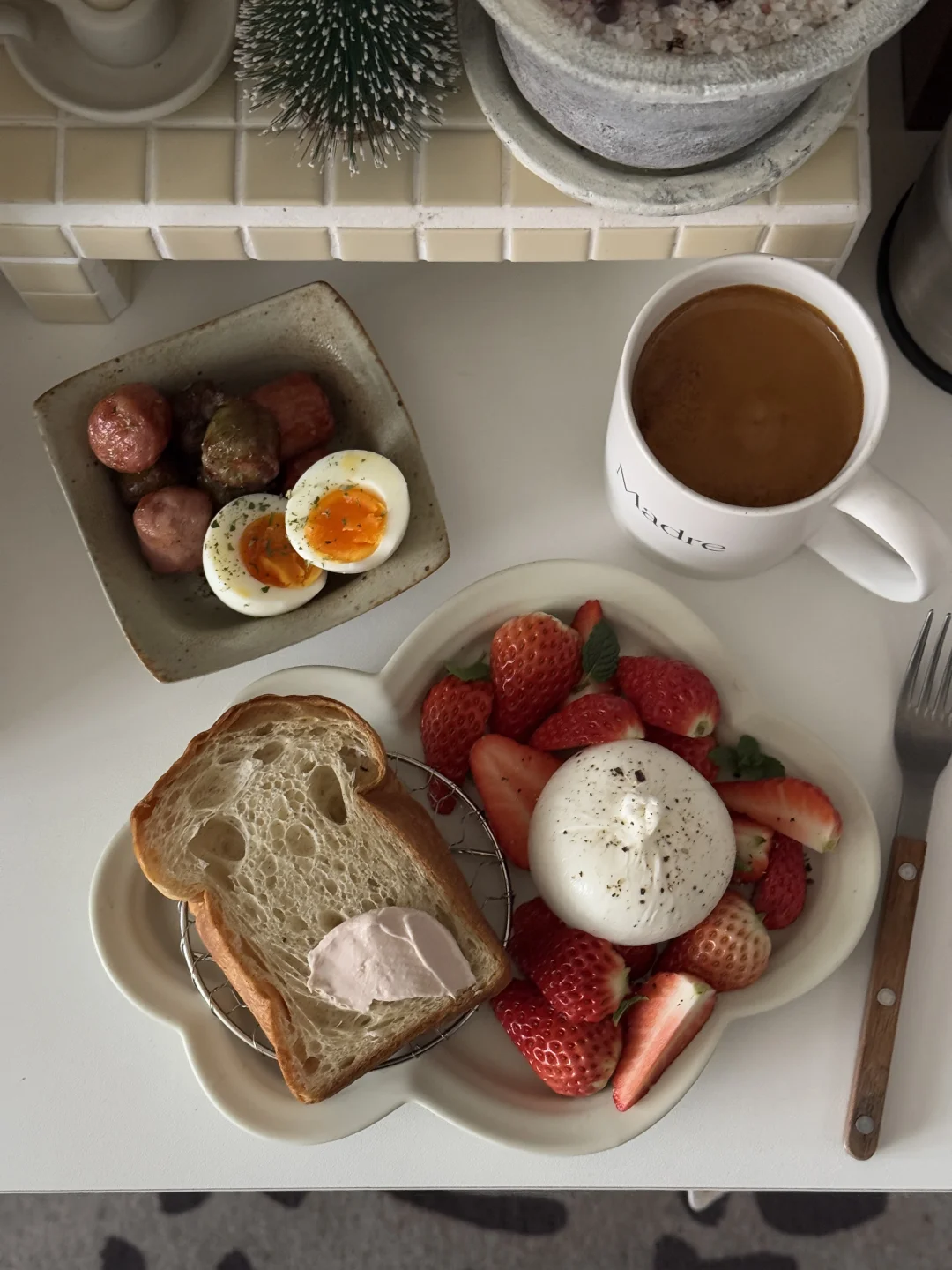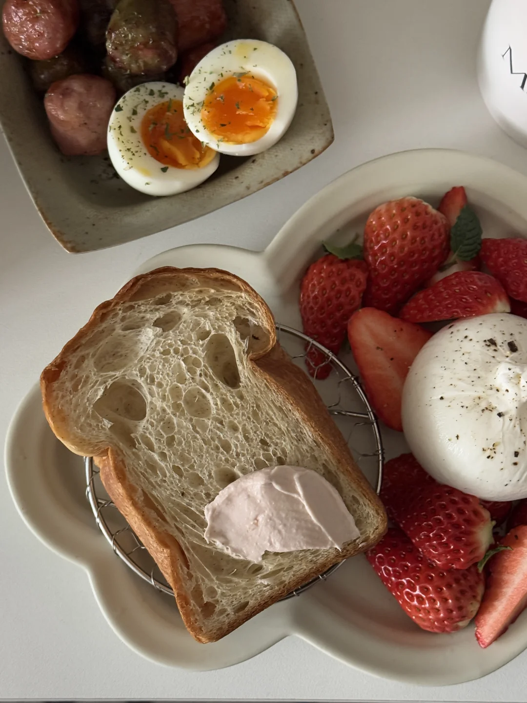 真的有被白草莓的价格震惊到 还是买点红草莓吃吃吧[暗中观察R] - 今日早餐🥣 - ▪️香草吐司|草莓布拉塔🍓|拿铁|烤肠🥚| - 厚切吐司吃着好过瘾 里面的香草籽还嫩嚼到[偷笑R]