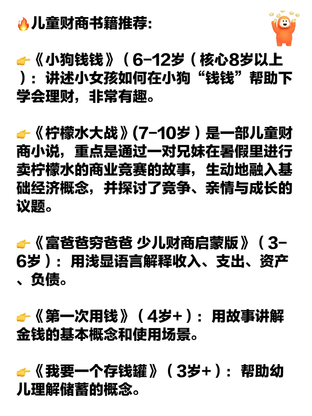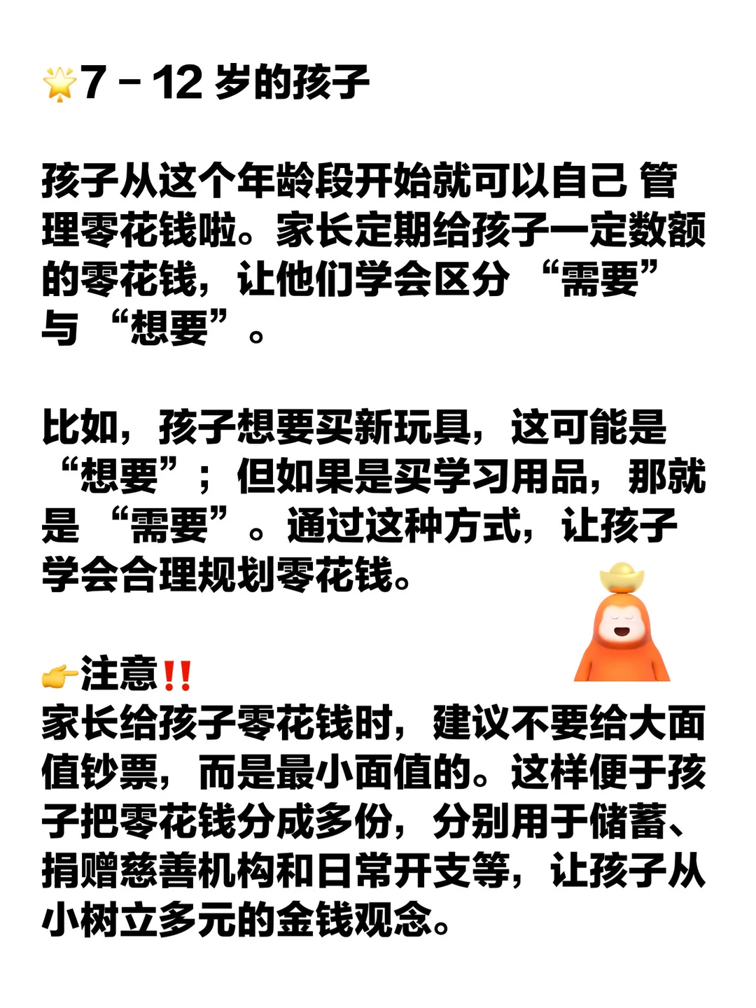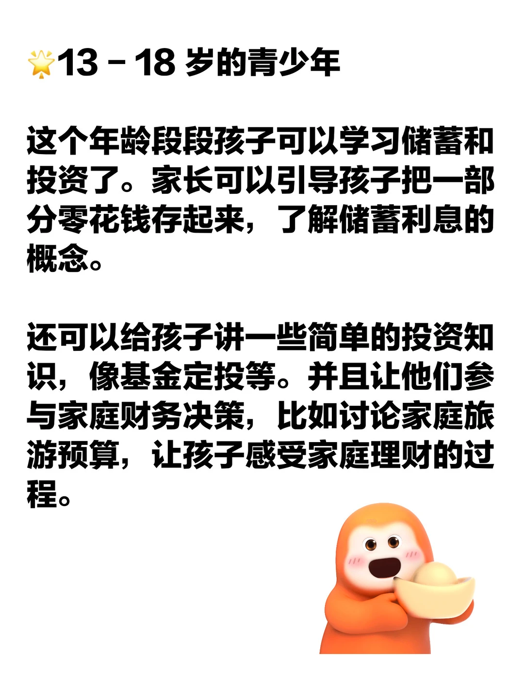 财商不是会赚钱,而是会管理钱。它包含了认识金钱、理解价值、学会规划与取舍的能力。 培养财商,本质上是教孩子建立与物质世界的健康关系。培养小孩财商的核心要点在于分阶段教育,把实践和理论结合起来,让孩子建立起对金钱的责任感。 这里整理了一份分年龄段培养孩子财商的指导建议,希望对大家有帮助,建议收藏用起来哦~[派对R]
