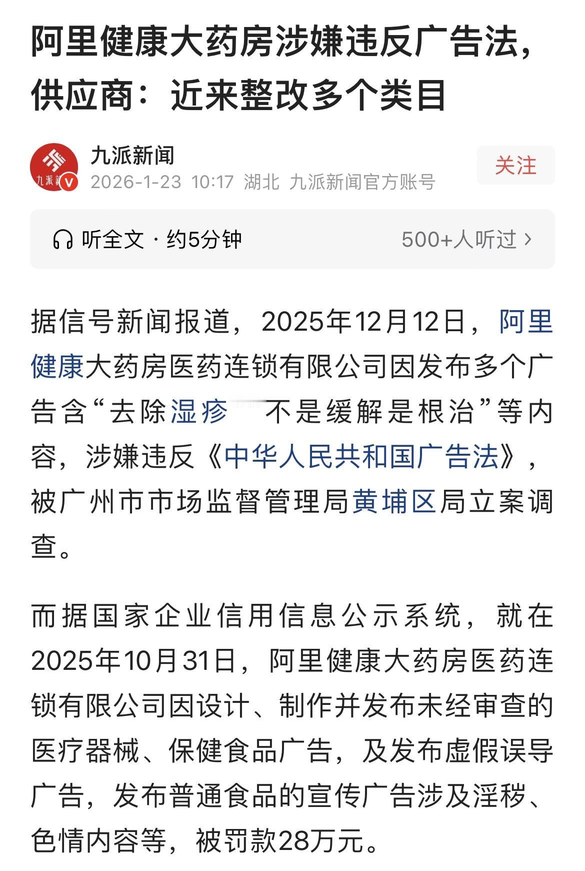 看到阿里健康大药房被查,吓了一跳,我可是经常在他家买药的呀~ 阿里健康大药房被查了,我一看心里咯噔一下,我平时总在他家买药,还好不是卖假药,是虚假宣传夸大药效,虚惊一场。 卖货的夸自己的货好很正常,可医药是治病救人的行当,半分假都不能有。 就算本事再大的医生,也不敢打包票说一针就能好,保证能根治。 消费者大多不懂专业医药知识,买药全看宣传和说明书。 你夸大药效甚至编不存在的效果,很容易让人选错药耽误病情,这种行为真的太不该。 更气人的是,他们为了躲监管和责任,还用错别字糊弄人。 就像根治两个字,故意把根多写一点,治少写一点,看着像根治,实则钻空子误导人。 网上这种情况特别多,看着是香港大药房,仔细看是香港大樂房。 海南免税店变成海南兔税店,一不注意就会中招。 有网友表示,以后还买阿里的药,没有假药,有药监局盯着呢。 其他平台假货多,还没人管,不敢随便买。 还有网友认为,这种商业现象哪个时代都有,不算违法很难杜绝。 消费者只能自己擦亮双眼,这种手段骗不到细心人,抓的就是不留意的人,愿者上钩罢了。 笔者认为,阿里药房还算可靠,我自己也常去买。 比起街边药店,价格亲民,可信度也高。 希望借着这次被查,好好整顿内部,别再搞浮夸宣传,踏踏实实做事。 守住口碑继续好好干,肯定能越来越靠谱。