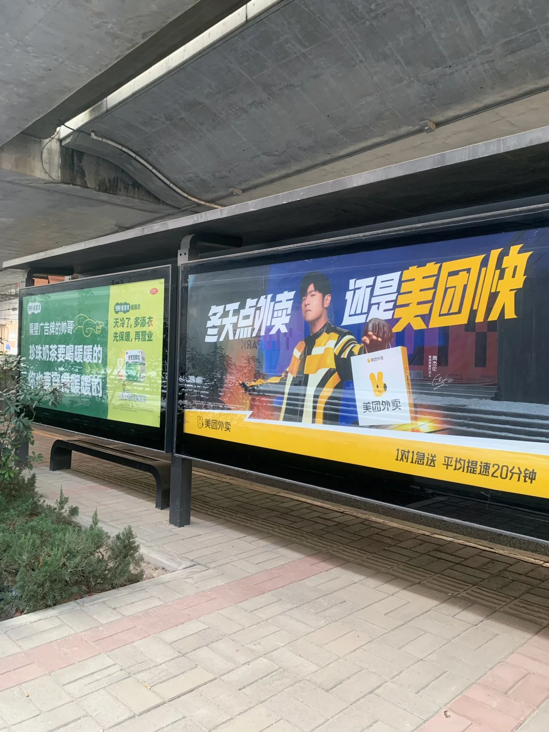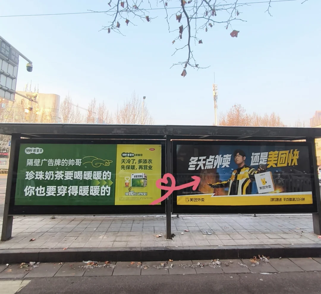 在零下的天气里 一抬眼就被这块广告牌戳中笑点 “隔壁广告牌的帅哥(我们的jay帅哥)珍珠奶茶要喝暖暖的 你也要穿得暖暖的”。