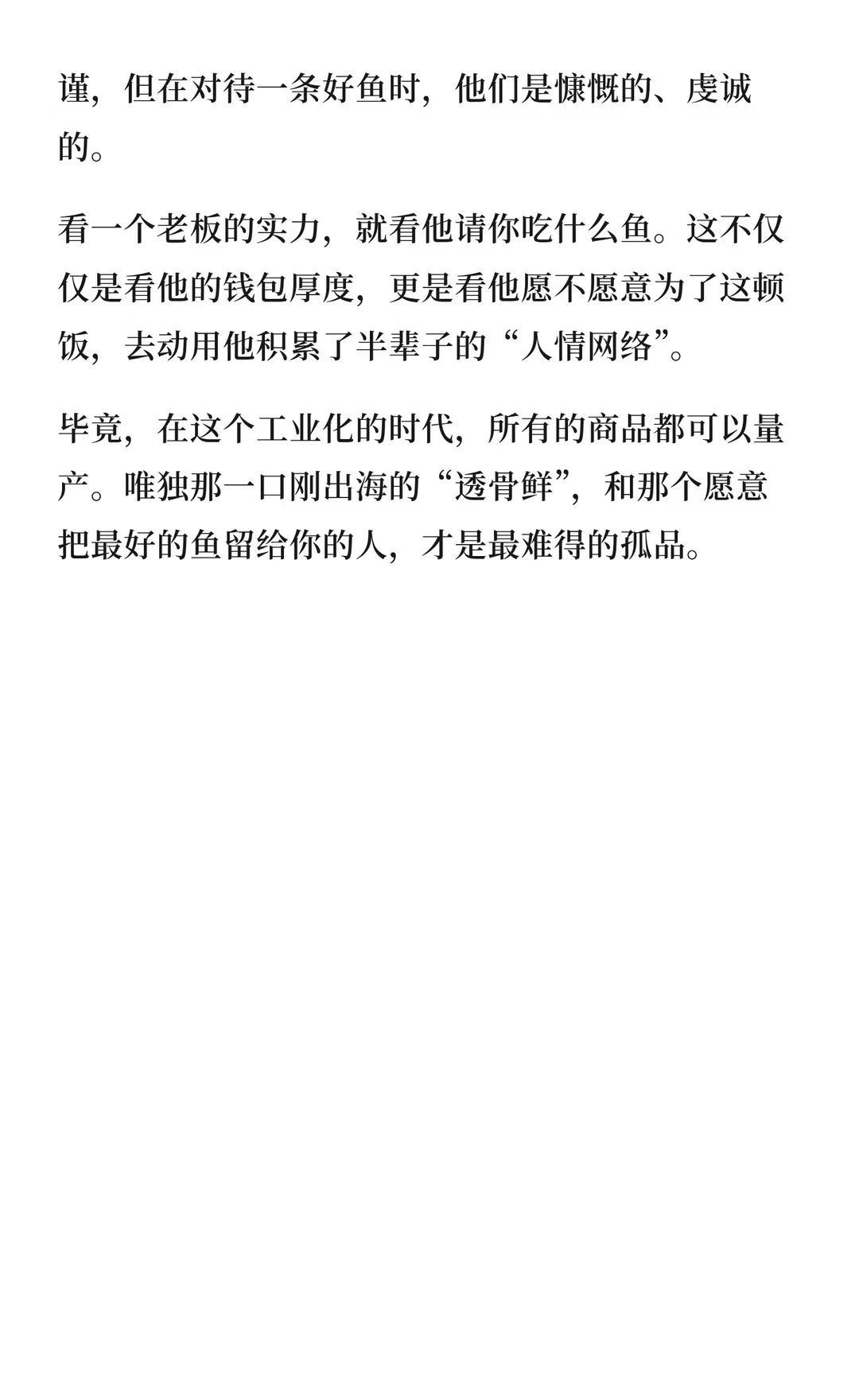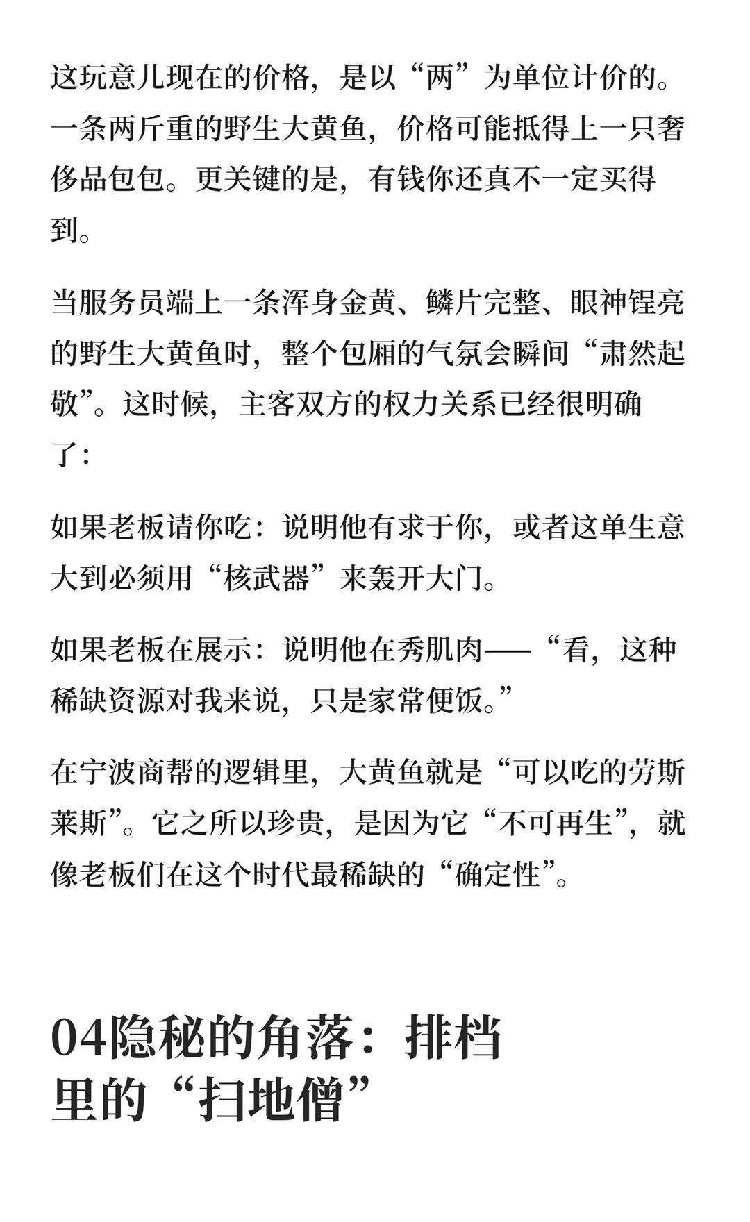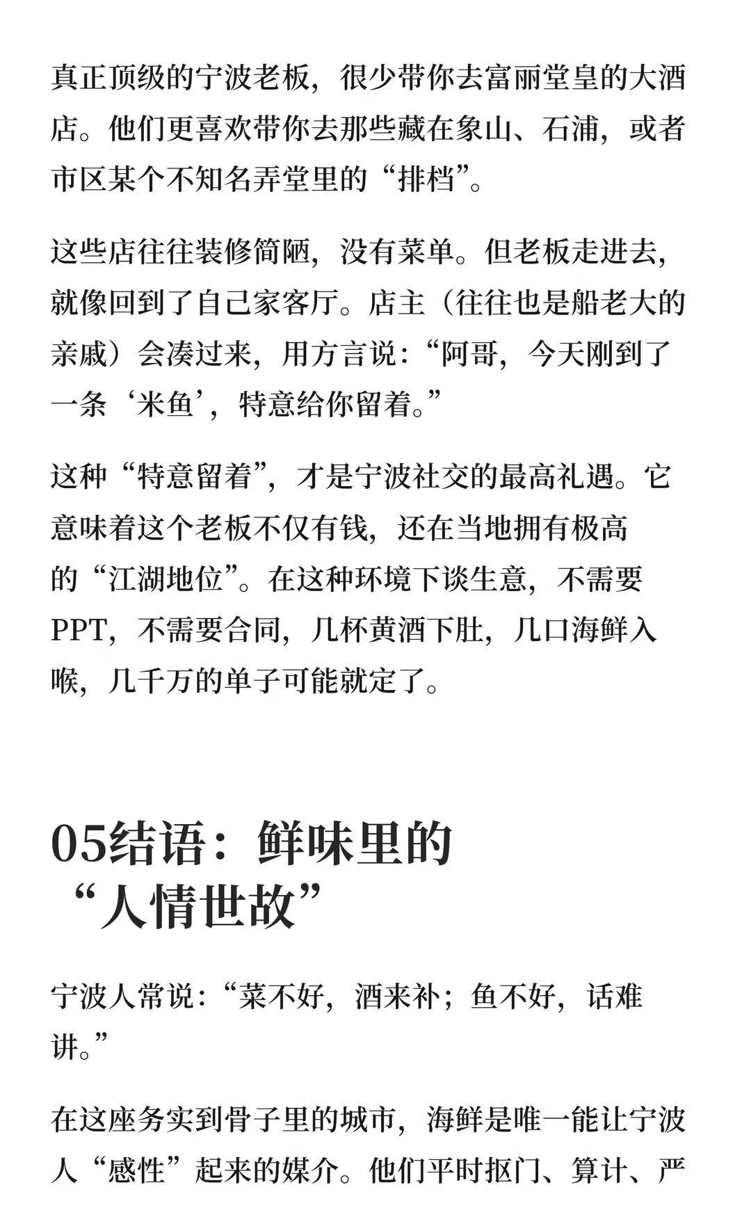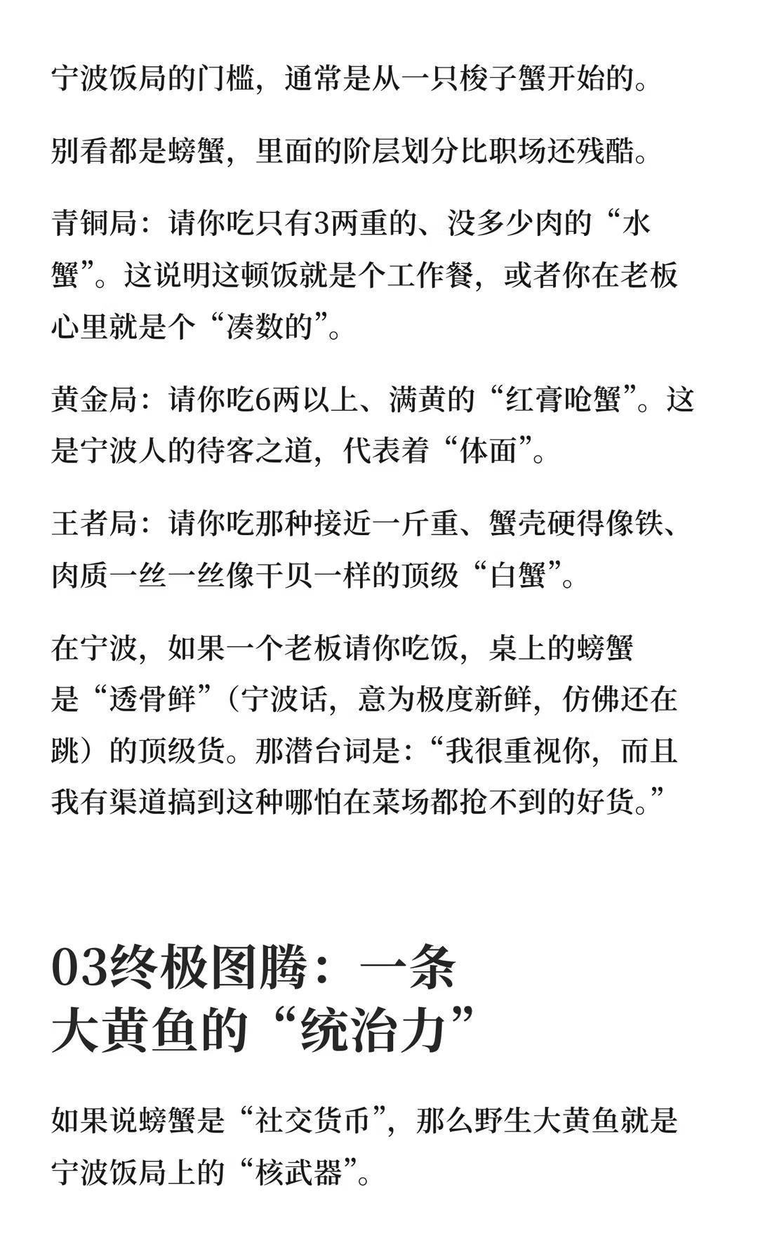 宁波社交潜规则:看一个老板的实力,就看他 在宁波,海鲜不仅是味觉享受,更是社交货币。从3两“水蟹”到顶级“白蟹”,再到野生大黄鱼,每一种海鲜都代表不同的权力与资源。顶级老板更愿意在排档展示“米鱼”,展现江湖地位与人脉。 吃商主理人 无尽臧也 项目总操盘手 商业思维的底层逻辑 品牌战略官 宁波 宁波海鲜