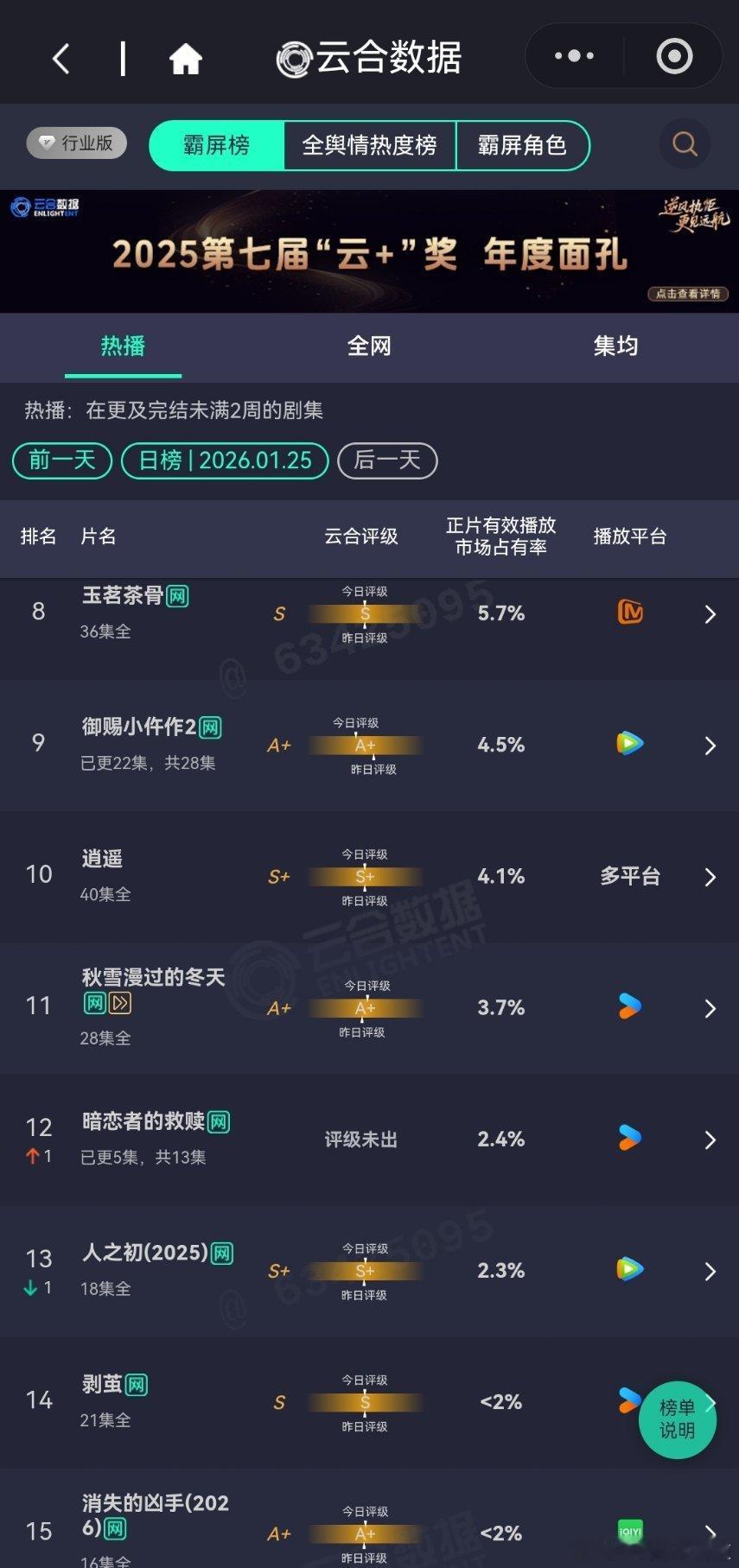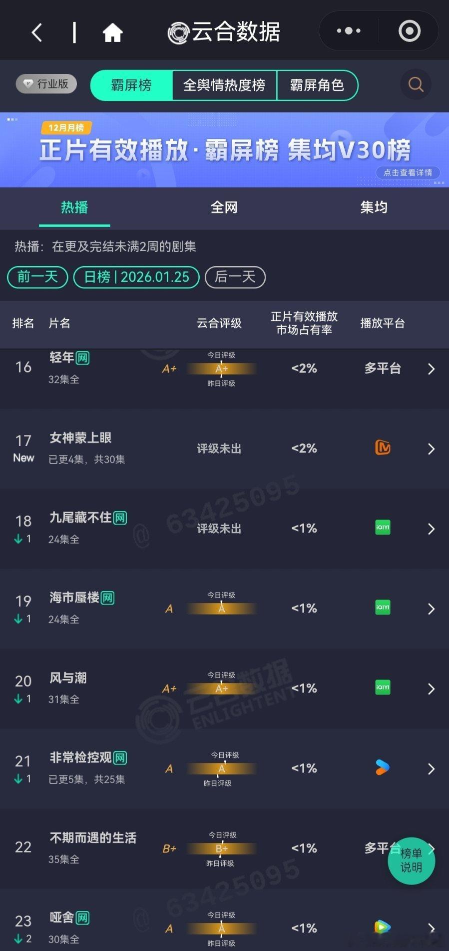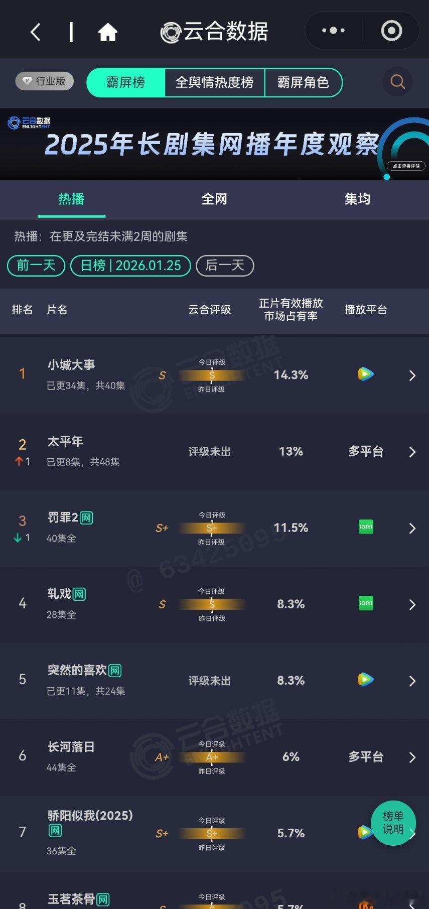1月25日云合播放占比云合 小城大事14.3%是真的很扑啊,不过又在榜首苟住了一天,也不容易。太平年 13%多平台相对于昨天来说涨幅是有横盘趋势了,期待早日登顶吧。罚罪2 11.5%苟住一天是一天,3500越来越近了。轧戏8.3%评级S还降了突然的喜欢8.3%正常水平御赐小仵作2 4.5%cp没搞起来,案例也没搞起来,唉。