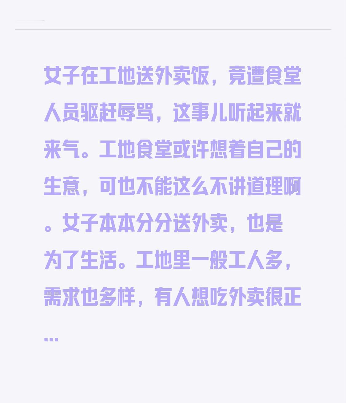 女子在工地送外卖饭,竟遭食堂人员驱赶辱骂,这事儿听起来就来气。工地食堂或许想着自己的生意,可也不能这么不讲道理啊。女子本本分分送外卖,也是为了生活。 工地里一般工人多,需求也多样,有人想吃外卖很正常。食堂人员这么一闹,不仅让女子受了委屈,也暴露了自己的狭隘。这事儿要是有个完整榜单,估计能让大家看看这恶劣行为有多过分外卖员冲突