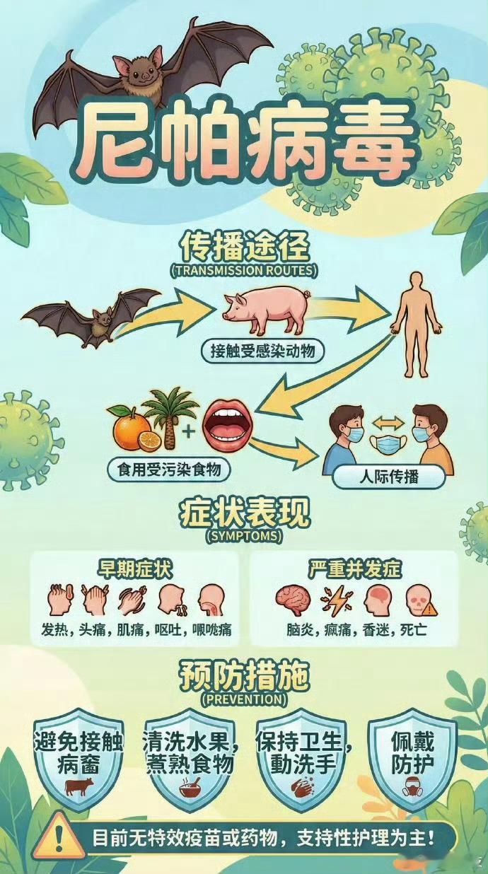 尼帕病毒潜伏期最长可达45天印度这个尼帕病毒看起来很可怕啊,不仅潜伏期长,而且死亡率竟然能够高达40%以上!现在是年关,咱们可能守住呀!不过目前我国已将尼帕病毒纳入检测范围 ,大家平时别接触野生动物,勤洗手爱干净,正常都没啥事!