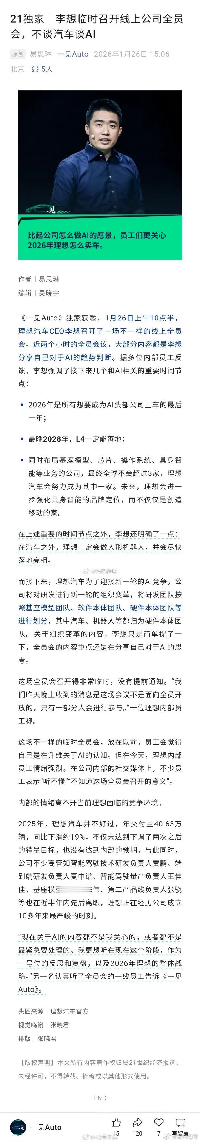 《一见AUTO》对理想全员会的报道文章中,结尾这段话应该是不少人对这次会议的看法。还有媒体,拿出来2022年李想在朋友圈中对2025年的预测。我们可以试着换几个角度理解一下理想和李想。正如文章结尾员工的话,理想头等大事是考虑卖车的问题,毕竟销量目标差不少、下滑是事实。但实际上,李想对于“汽车是第一个硅基机器人”等描述,不代表公司核心业务的变化,重视AI不代表轻视汽车。汽车的业务遇到困难,流程上是成熟的,不需要理想的1号位占用过多精力。从公开信息已经知道,理想2026年有i6、更重要的是换代的L9和重大更新的其他L系列,这些基本能稳定理想的基本盘了。不管愿意还是不愿意承认,大尺寸增程SUV新车很多,但是理想的L系列已经有了自驱动的口碑属性了。那1号位的李想,会上说的基座模型、AI以及“3家公司”的言论怎么理解呢?更加确认了李想“干大事”“上行业历史史册”的宏大志向,这个在之前已经非常确定了。看看国内外不同维度的企业,汽车企业、科技企业、新的独角兽企业和传统互联网巨头,能集齐基座模型、推理芯片、操作系统、具身智能业务的,有几家?(豆包给的只有6家,华为、百度、智元机器人、谷歌、特斯拉、英伟达)宣布2028年一定落地L4的企业,有几家?我看到的不光是李想的志向,看到的是哗啦啦的钱,千亿级别的投入。按照现在理想汽车的营收水平,倒也可以覆盖得了。李想临时召开线上公司全员会 李想要求人形机器人尽快落地亮相 李想预测L4最晚2028年落地