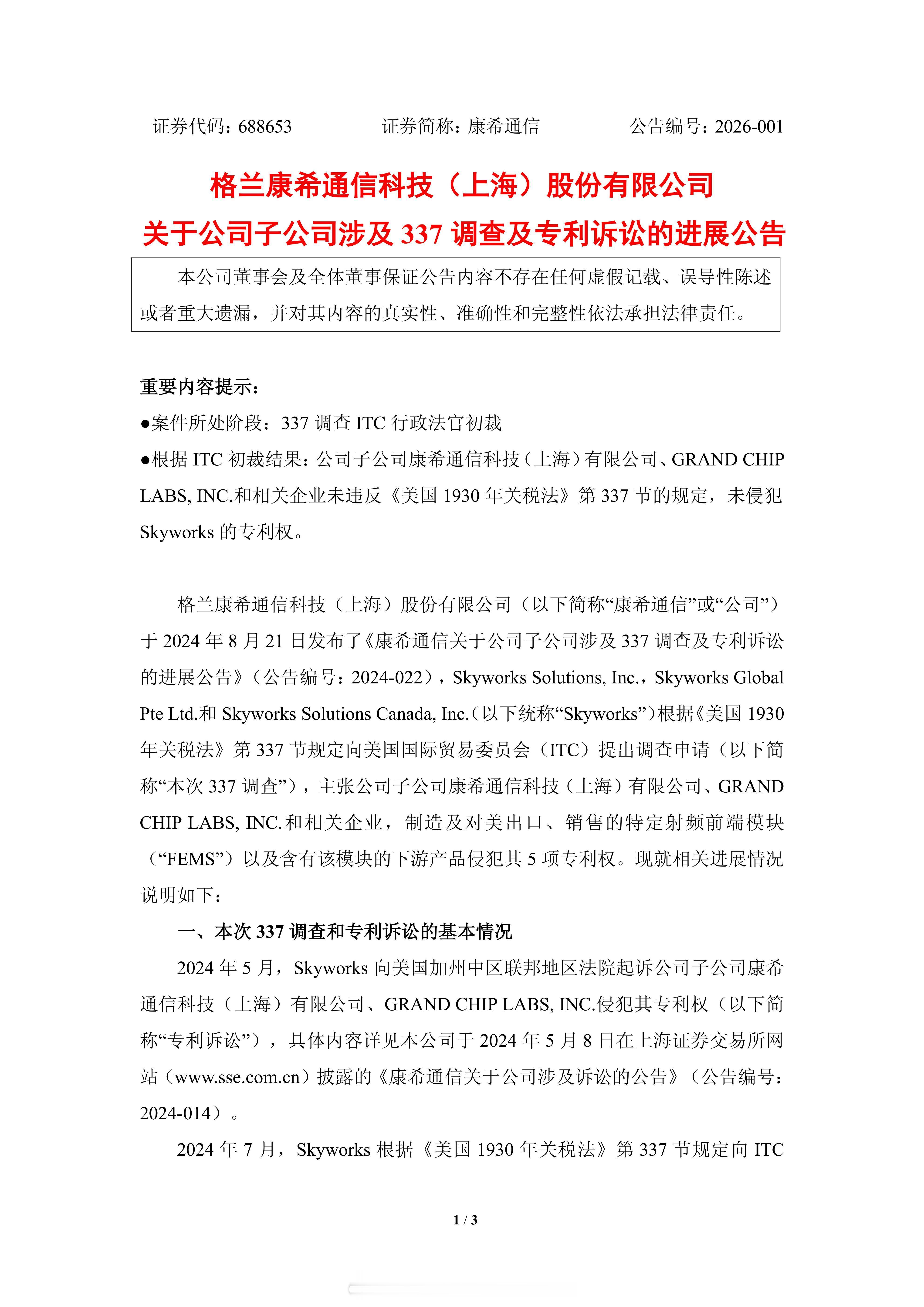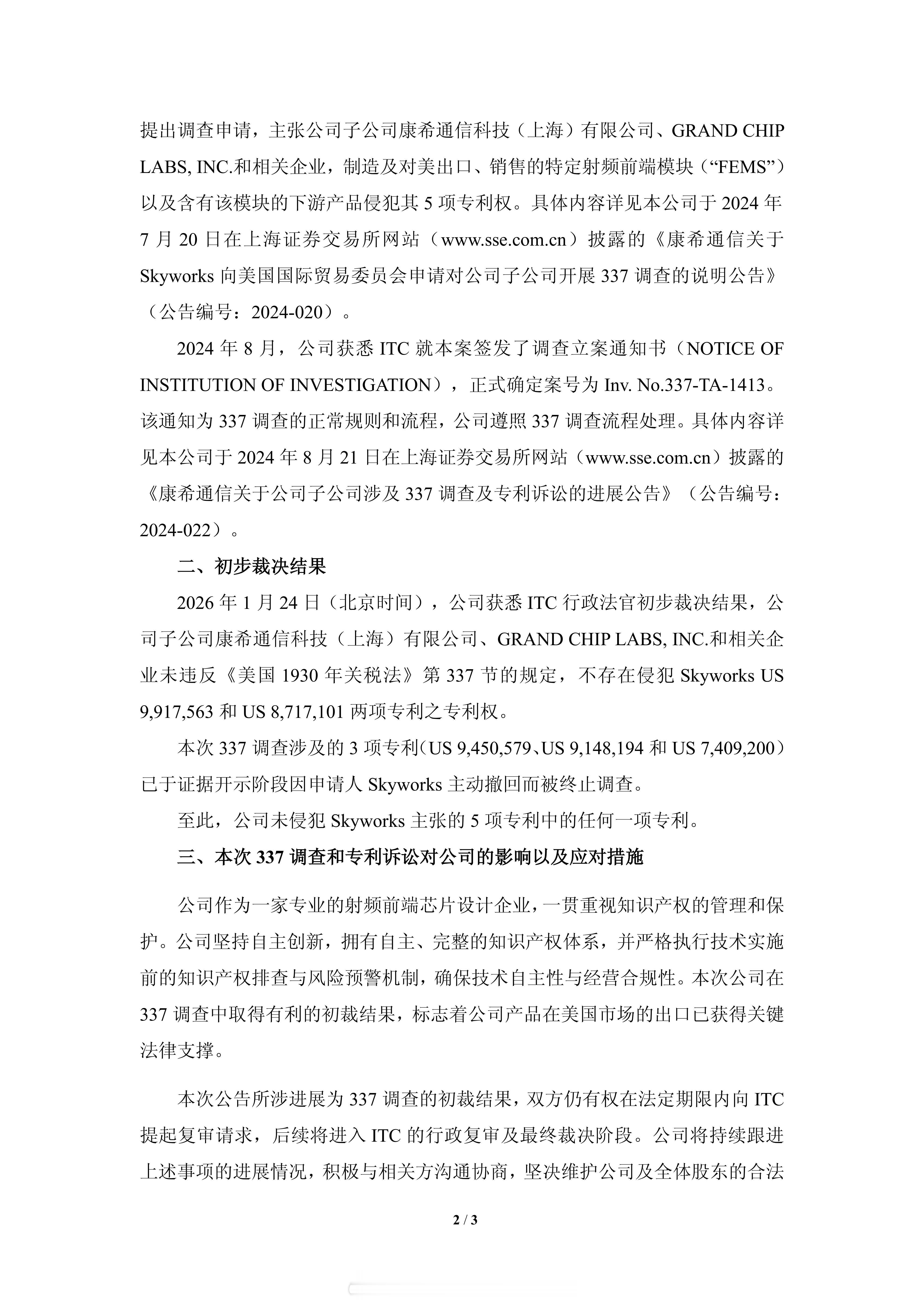 又一家中国公司打赢“337 调查”的初裁:2026年1月26日上午,格兰康希通信科技(上海)股份有限公司发布 337调查初裁结果发布会,会上整体介绍了美国 Skyworks公司对康希通信发起的美国 337 调查初裁结果。根据当日康希通信发布的 337调查及诉讼进展公告中显示,美国国际贸易委员会 ITC 在 2026 年 1 月 23 日作出初步裁决结果,认定康希通信等相关公司不存在侵犯 Skyworks 公司的 US9,917,563 和 US 8,717,101 两项专利之专利权。另外3件发起调查的专利(US9,450,579、US9,148,194和US7,409,200),已于证据开示阶段因申请人Skyworks主动撤回而被终止调查。至此,康希通信未侵犯 Skyworks 主张的5项专利中的任何一项专利。康希通信是国内领先的 Wi-Fi 射频前端芯片及模组厂商绝对龙头,下游客户为:中兴通讯、吉祥腾达、TP-Link、京东云、天邑股份等知名通信设备品牌厂商以及共进股份、中磊电子、剑桥科技等行业知名ODM厂商的供应链体系,也有部分产品通过ODM厂商间接供应于欧美海外电信运营商。其 Wi-Fi 6、Wi-Fi 7 产品已通过博通、高通、联发科、瑞昱等全球主流 SoC 厂商平台的参考设计认证,已进入法国Free、德国电信DT、法国Orange、意大利Fastweb、英国Vodafone、英国BT等海外运营商供应链,并出口至欧洲、南亚、东南亚等地区。而 Skyworks 很多人可能不熟悉,但它是你手机里的常客……其 2024 财年营收约 47-50 亿美元,2025 年财年前三季度收入约 30 亿美元,毛利率维持在 40% 以上高位,是全球前五大射频PA器件供应商之一。早年你在手机里经常能看到它的射频前端芯片的配备,华为当时因制裁不能生产 5G 手机也跟当时手机上的 5G 射频前段芯片主要采用 Skyworks、Qorvo 等美国公司的产品有关,而后来国产射频前端和功率芯片取得量产突破之后(唯捷创芯、卓胜微等)华为开始恢复 5G 手机的生产,而现在也有大量国产手机转向国产射频前端和功率芯片的采用。康希通信9000万诉讼费打赢美国公司康希通信5项专利零侵权美国公司