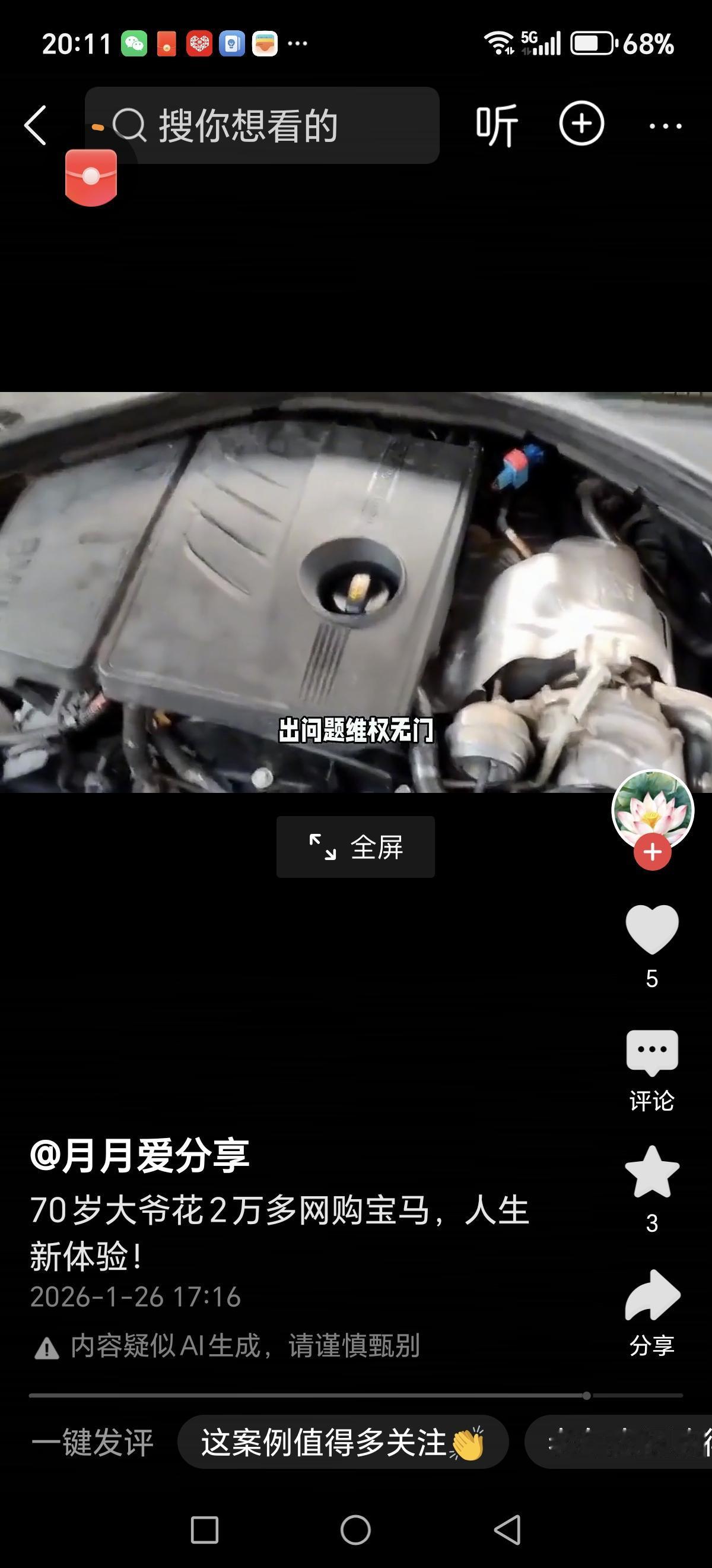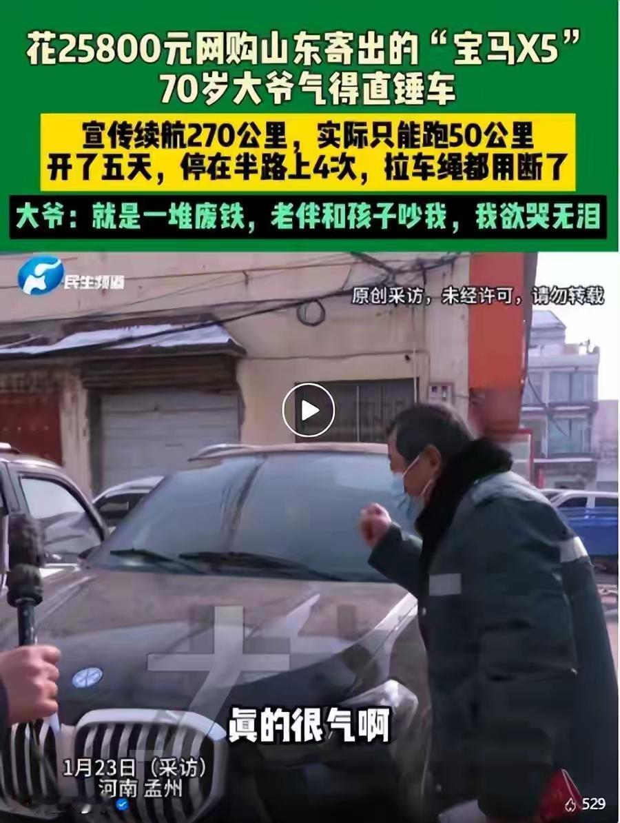 这起“买车被骗”的事件,令人感慨万千,也再次敲响了网络购物中的警钟。70岁的大爷花了2.58万元网购一台“宝马X5”,期待着拥有一辆豪华座驾,却没想到五天内半路抛锚四次,续航不到50公里,最终变成了“废铁”,让老人一家陷入了失望与无助。 事情的经过是这样的:大爷在某平台看到一则“宝马X5”的广告,价格远低于市场价,便心动购买。卖家声称是山东厂家直发,货到后,老人满心期待。然而,提车后,问题接连出现:续航标称270公里,却连50公里都跑不到;车辆频繁抛锚,拖车绳都被拉断,成了“烂铁堆”。 这不仅是一次简单的购物悲剧,更反映出一些网络平台虚假宣传、虚假商品的严重问题。老人一家焦急、愤怒,也让人深思:为什么如此诱人的价格会出现如此低劣的商品?如何保护老年人等弱势群体的权益? 这起事件提醒我们:在网络购物尤其是汽车等大件商品时,一定要提高警惕。不要被低价迷惑,要选择正规渠道、官方授权店铺购买,避免掉入“价格陷阱”。同时,相关部门也应加强监管,打击虚假宣传和售假行为,保障消费者权益。 对老人而言,这次经历虽令人心碎,但也值得我们反思:社会应为弱势群体提供更多保护和帮助,让他们不再在网络虚假广告中受骗。家庭和子女也应多关注长辈的网络购物行为,提供正确的引导。 这场“买车”闹剧,虽然令人唏嘘,但更希望通过曝光,唤起社会对网络诚信和消费者权益保护的重视。让我们共同努力,营造一个诚信、安全的消费环境,避免类似悲剧再次发生。二手车骗局 直播卖车骗局