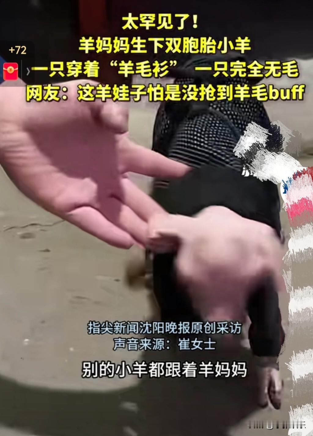 “这真是一件稀奇事”,这事发生在新疆阿勒泰,养殖户崔女士家的羊妈妈在1月22日诞下了一对双胞胎小羊,却出现了极致的反差。 崔女士和丈夫去喂草时,发现母羊生下了两只小羊。其中一直很正常;而另一只则全身光秃秃的,一根毛都没有,直接看得到皮肤。 因为当地室外气温低至零下30度,无毛小羊特别怕冷。崔女士赶紧把它抱到屋里暖和,过了一会儿它就慢慢站起来,开始主动喝奶了。为了防止它着凉,崔女士还特意给它穿上了一件黑色的小衣服保暖。 这只无毛小羊目前状态很好,吃奶正常,活泼好动,和别的小羊一样健康。但因为怕冷,它不能跟着羊妈妈在圈里待着,只能住在温暖的屋子里,需要吃奶时再把羊妈妈领进来。 崔女士表示自己养了十几年羊,还是第一次遇到这种情况。邻居们听说后也纷纷赶来围观,都觉得十分稀奇。 这个视频在网上迅速走红,网友们纷纷调侃:“这羊娃子怕是没抢到羊毛buff”“一个像冬天,一个像夏天”,还有人开玩笑说这是“裸奔崽”。 这个真有点神奇的哈。你还见过其他无毛的动物吗?