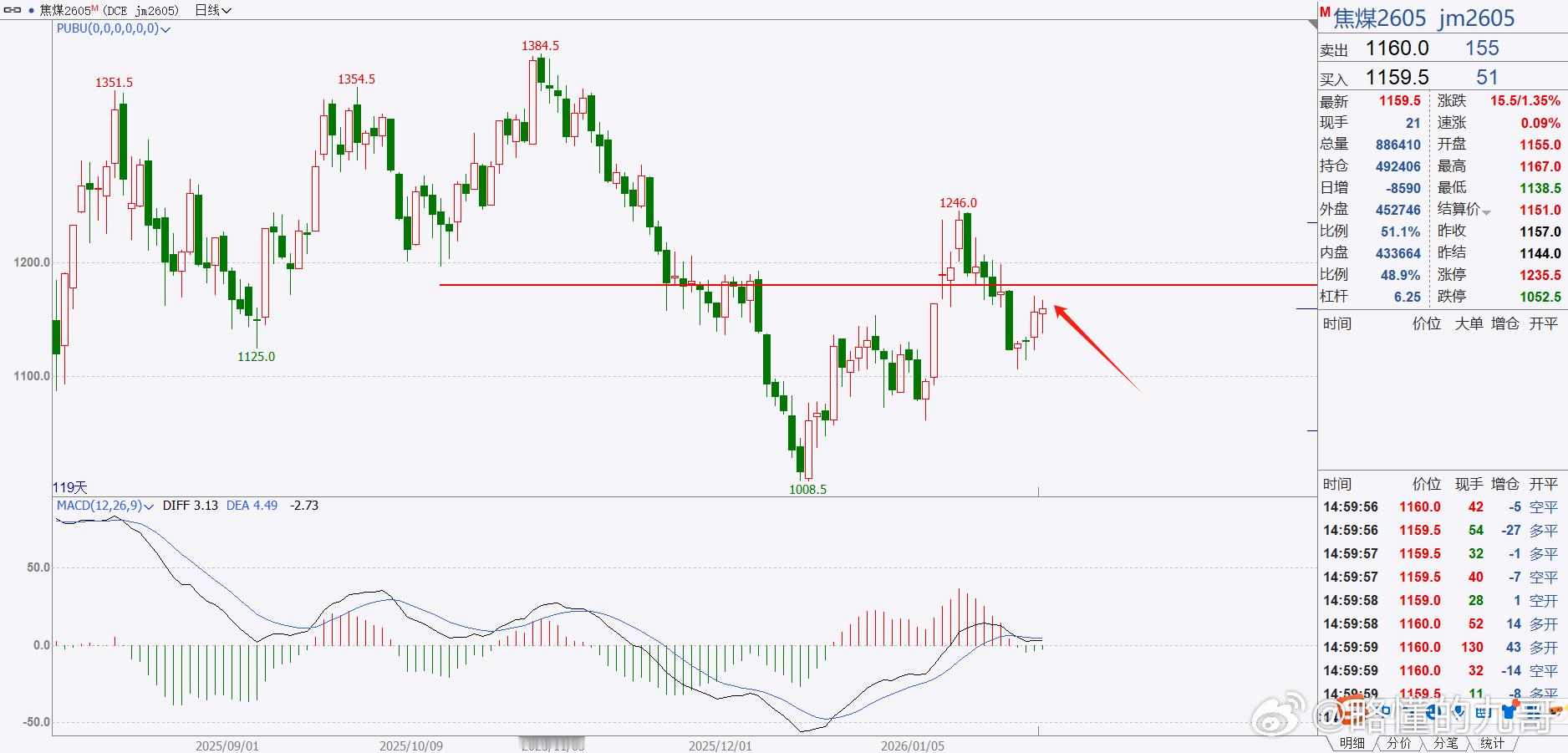 期货 焦煤目前回调依然没有结束,继续看1180是否能收出大阳线!注意,如果在1180收出长上影线的话,回调也结束不了!回调不做多,这是交易基本纪律,在回调结束后再进行多单操作!焦煤焦煤