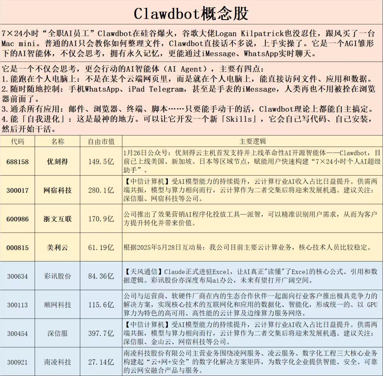 美股那个半年跌去一半的算力租赁公司,CoreWeave开始涨了,而且大涨10%。昨天文章也说了算力租赁最近的价格涨价了。背后是需求起量,各家大厂开始流量入口争夺战,其实各种智能体你也说不上来谁好用难用,都差不多,关键就在于一开始你用的是谁,用顺手了。 第二,爆火的“全职AI员工”Clawdbot,也就是AI Agent,实现了在电脑上帮你干活。