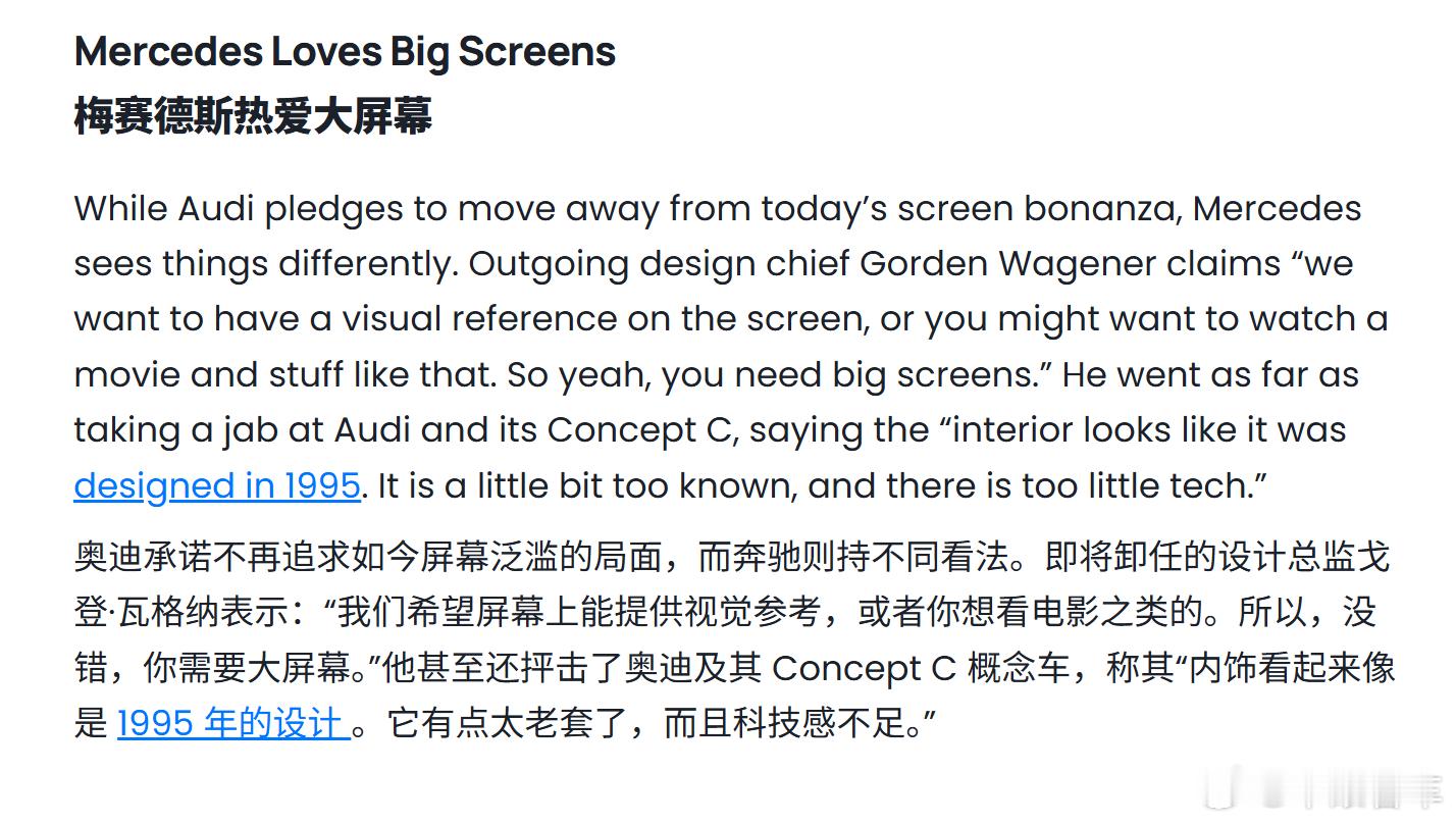 内饰屏幕就是要做减法,车内交互没有本质改变或提升,堆叠屏幕成了最简单的彰显“智能”的手段,其实很多多屏幕的车型交互做得跟智障一样。然后恰巧有几款多屏车型热销了,就想当然地觉得人家大卖是屏幕的功劳。其实如果从这个角度就没法解释特斯拉和小米。堆叠屏幕归根结底就是设计师偷懒和决策层讨巧文中引用的瓦格纳观点今天已经不重要了,新设计总监其实最容易彰显自己不一样就是这些