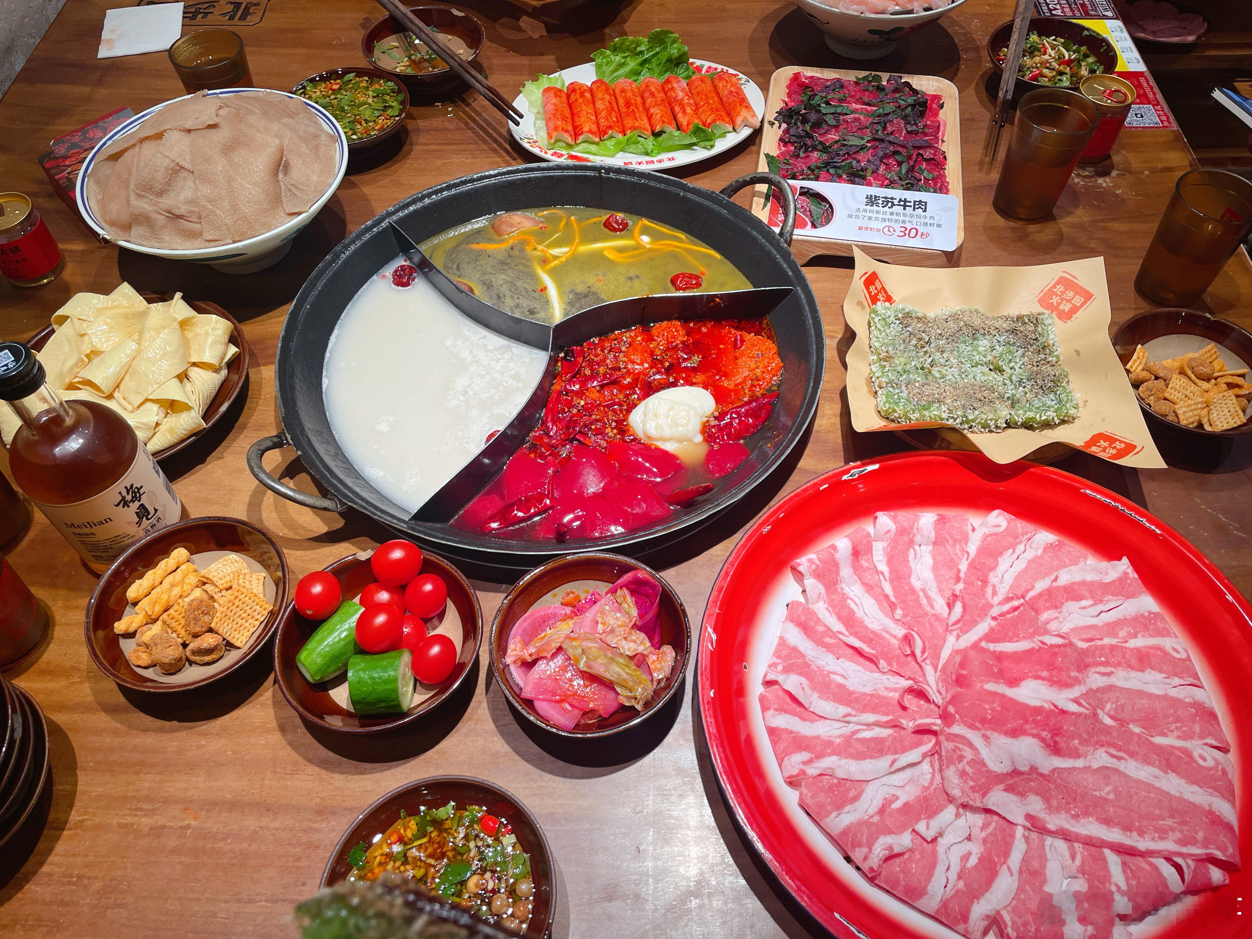 家乡年味大赏新年第一个聚餐搭子新年小聚碰出轻松好运奔赴深圳北步园,解锁地道重庆火锅!三味奔驰锅承包所有口味,紫苏牛肉涮红汤鲜嫩到爆,绿油油的糍粑外脆里糯超解腻,泡泡豆干吸饱汤汁是素食爱好者的福音,软嫩入味,越嚼越香。店里的自助调料台非常有特色,不仅提供了经典的重庆油碟配方,还有非遗麻花、锅巴、胡豆等免费小食无限畅吃,这顿重庆风味局,谁吃了不迷糊!