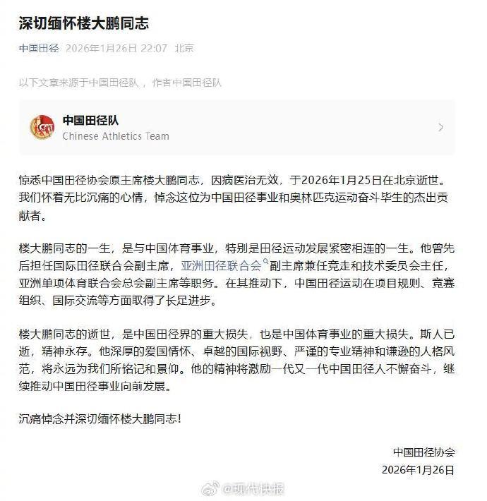 【#中国田径协会原主席楼大鹏逝世#】#北京申奥功臣楼大鹏逝世# 1月26日,中国田径协会发布讣告:惊悉中国田径协会原主席楼大鹏同志,因病医治无效,于2026年1月25日在北京逝世。我们怀着无比沉痛的心情,悼念这位为中国田径事业和奥林匹克运动奋斗毕生的杰出贡献者。楼大鹏同志的一生,是与中国体育事业,特别是田径运动发展紧密相连的一生。他曾先后担任国际田径联合会副主席,亚洲田径联合会副主席兼任竞走和技术委员会主任,亚洲单项体育联合会总会副主席等职务。在其推动下,中国田径运动在项目规则、竞赛组织、国际交流等方面取得了长足进步。楼大鹏同志的逝世,是中国田径界的重大损失,也是中国体育事业的重大损失。斯人已逝,精神永存。他深厚的爱国情怀、卓越的国际视野、严谨的专业精神和谦逊的人格风范,将永远为我们所铭记和景仰。他的精神将激励一代又一代中国田径人不懈奋斗,继续推动中国田径事业向前发展。沉痛悼念并深切缅怀楼大鹏同志!#楼大鹏逝世# 楼大鹏,曾担任国际田联副主席、中国奥委会副主席。1956年,他第一次打破男子200米低栏的全国纪录;1958年,在首届全国大学生田径运动会上,他以25秒2的成绩再次打破这一项目的全国纪录,并获得金牌。虽然因伤错过第一届全运会,但楼大鹏拥有较高的英语水平和丰富的运动经验,后进入国家体委国际司工作。其间,楼大鹏参与了中国“乒乓外交”的破冰之旅,经历了中国在各个国际体育组织中合法席位恢复的全过程。1991年和2000年,楼大鹏两次出任北京奥申委体育主任并担任申奥主要陈述人,为北京成功申办奥运会作出了重大贡献。