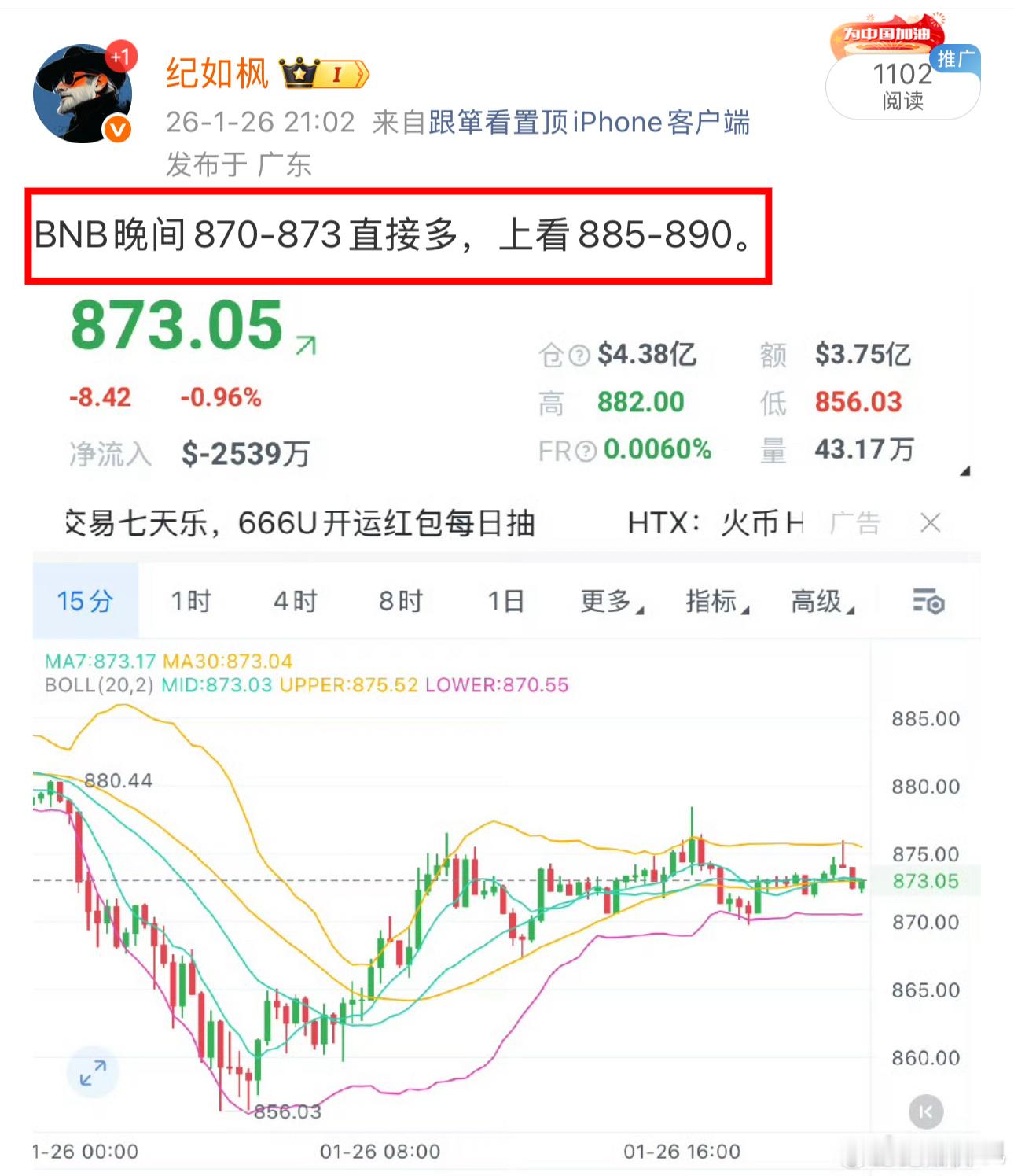 BNB晚间870-873直接多,上看885-890。
