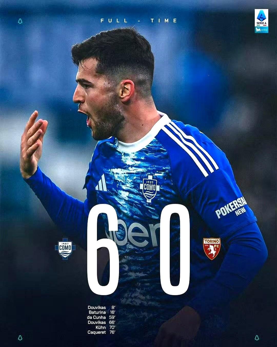 意甲真乱套了!一支刚从意乙爬上来的队,直接冲到了积分榜第二! 说的就是科莫。昨晚主场对都灵,上来就是一顿猛揍,6-0啊!直接把对手打出惨案。 组维卡斯梅开二度,巴图里纳更是疯了,一脚世界波技惊四座,外加两次助攻。 还有达库尼亚的点射,连替补上来的屈恩和卡克雷都进球了,全员开火! 你敢信?法布雷加斯带的这支升班马,赛季进球数37个,已经超过了AC米兰。 这一场大胜后,科莫积分来到40分(多赛一场),暂时把尤文挤了下去,离第四的罗马就差2分。 感觉罗马、那不勒斯、米兰这些老牌劲旅,后背都开始发凉了。