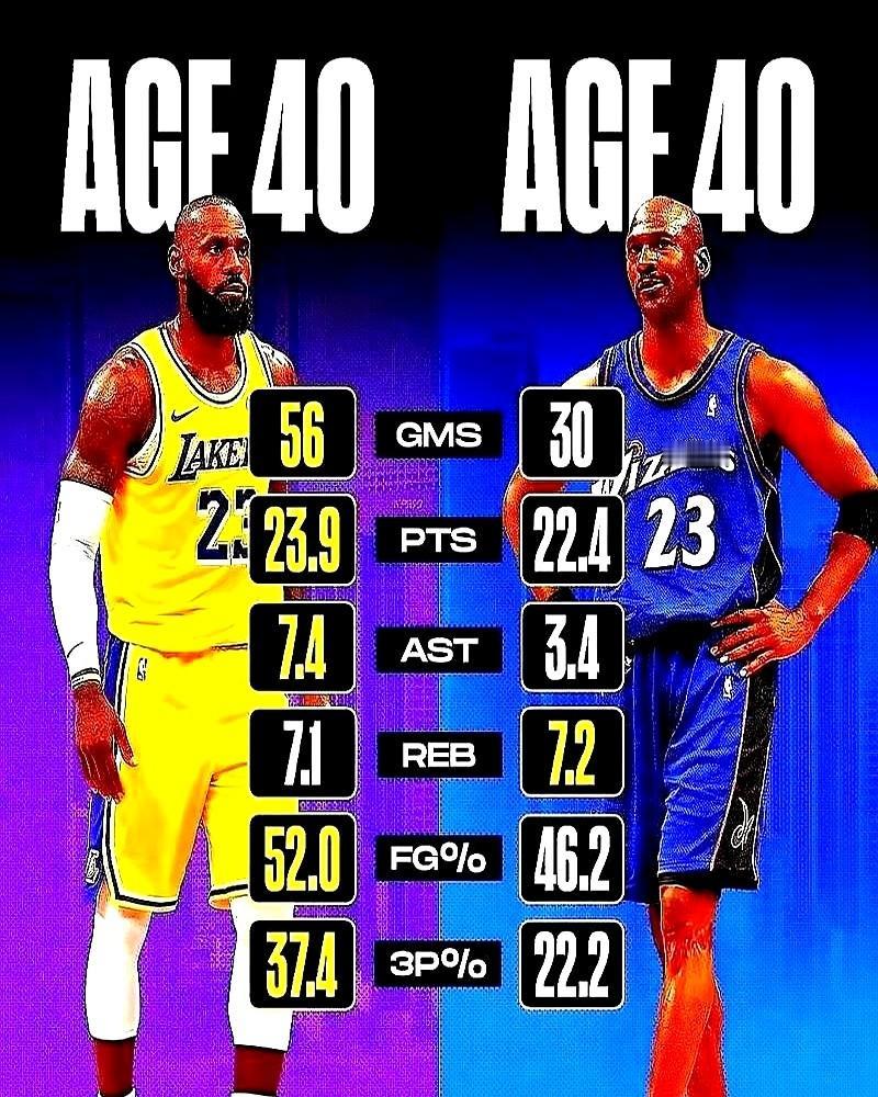 40岁的乔丹,年薪103万,打满82场。40岁的詹姆斯,年薪5300万,打了70场。 这对比,绝了! 当年“飞人”在奇才,膝盖积水都得抽,硬是全勤一场没歇。 老哥的原话是,球员的工作就是每天上场,那会儿全勤就是战士的勋章。 再看老詹,成了NBA史上第一个年薪超5000万的40岁球员,身体是核心资产,得用“负荷管理”精细维护。 一个把比赛当荣誉,一个把身体当生意。 时代真的不一样了,这种“天塌下来也得上”的拼劲儿,现在不多见了……