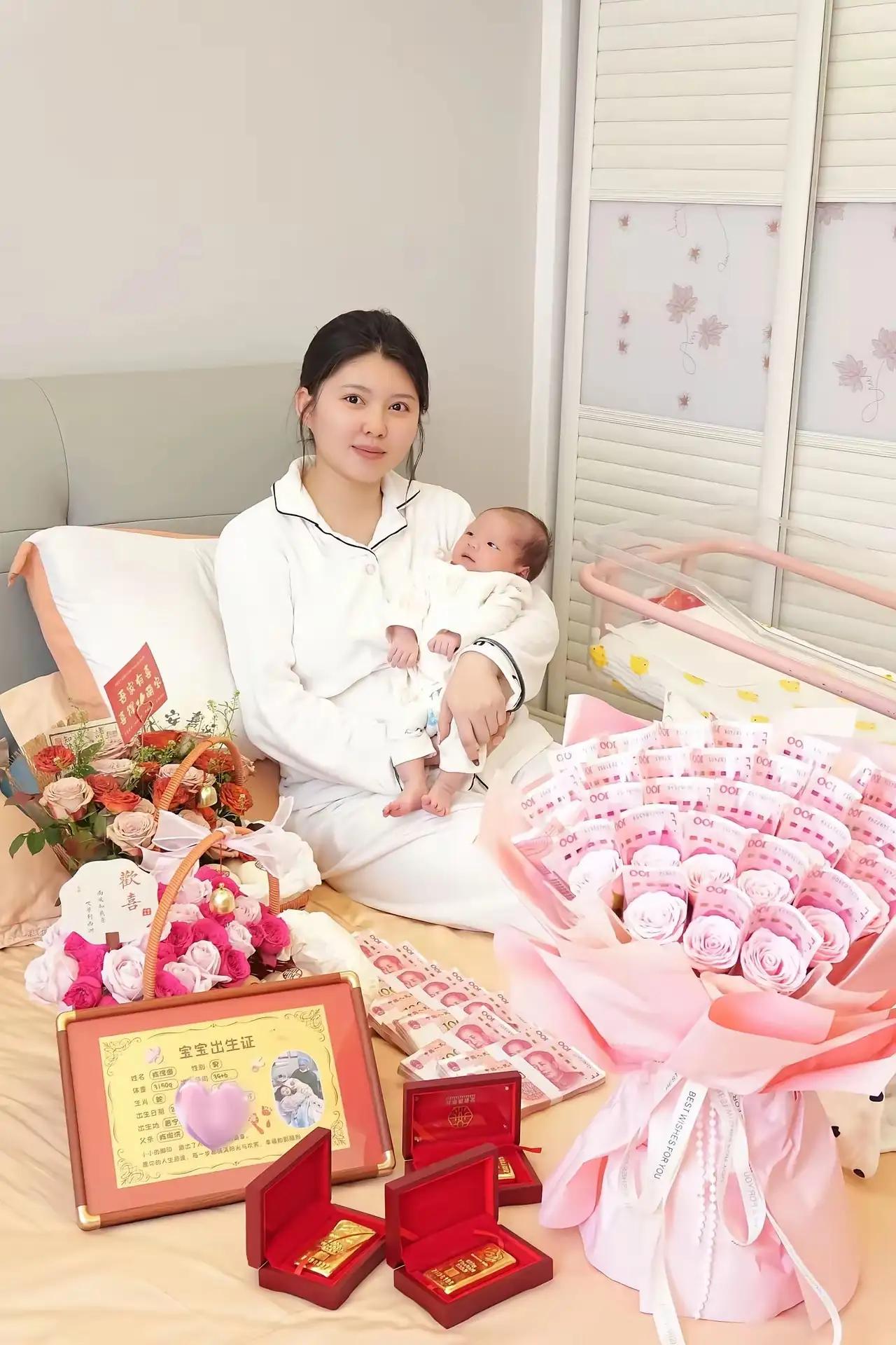 一个女人最幸福的时刻莫过于此吧!孩子一出生,办理好宝宝的出生证以后!爷爷奶奶就赠出豪礼给女人!一束用毛爷爷装束起来的有钱花,还有三金礼品,金项链,金戒指,金手镯!女人旁边还有九叠厚厚的现金排成了一字形! 女人抱着刚出生的宝宝躺在床上,看上去有些疲惫,没有笑容!但是内心是甜的!小宝宝的降临,将会给她带去新的生活和希望! 所以女人选择自己的另一半的时候,一定要选择一个有经济能力的男人,年龄大点没关系!千万不要相信所谓的真爱!真爱在残酷的现实生活面前有时候真的一文不值!
