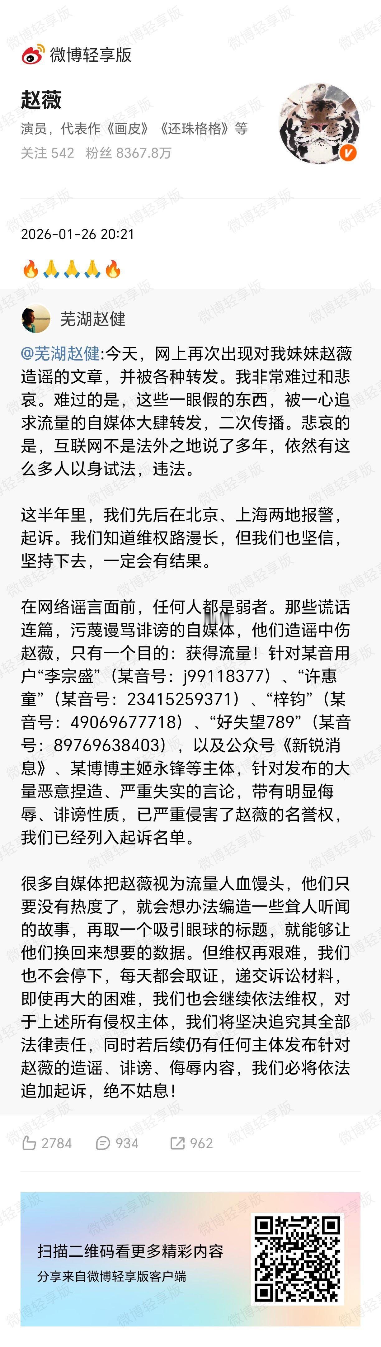 赵薇回应网传信息,她转发的赵健是她哥哥,大家怎么看?王岳伦发文