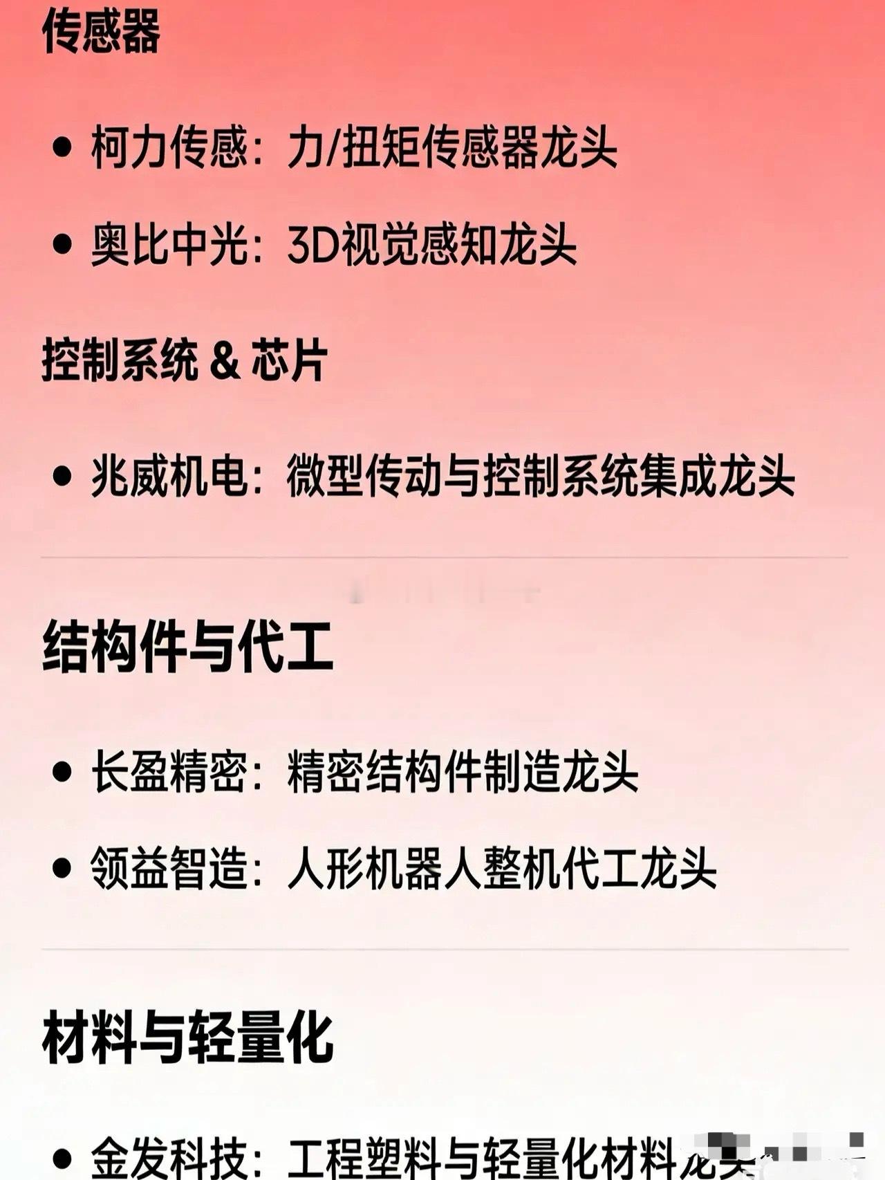 人形机器人概念龙头企业全汇总整机与系统优必选:全栈自研人形机器人整机龙头宇树科技:消费级人形机器人龙头拓斯达:工业场景人形机器人落地龙头新松:国有工业人形机器人龙头埃斯顿:高端制造用人形机器人龙头智元机器人:AI+具身智能人形机器人龙头小鹏汽车:车企跨界人形机器人龙头 核心零部件减速器绿的谐波:谐波减速器龙头双环传动:RV和谐波双线布局减速器龙头伺服系统 & 电机汇川技术:伺服系统龙头鸣志电器:空心杯电机及灵巧手驱动龙头卧龙电驱:机器人专用电机龙头执行器 & 丝杠三花智控:一体化关节执行器龙头五洲新春:行星滚柱丝杠龙头传感器柯力传感:力/扭矩传感器龙头奥比中光:3D视觉感知龙头控制系统 & 芯片兆威机电:微型传动与控制系统集成龙头 结构件与代工长盈精密:精密结构件制造龙头领益智造:人形机器人整机代工龙头 材料与轻量化金发科技:工程塑料与轻量化材料龙头