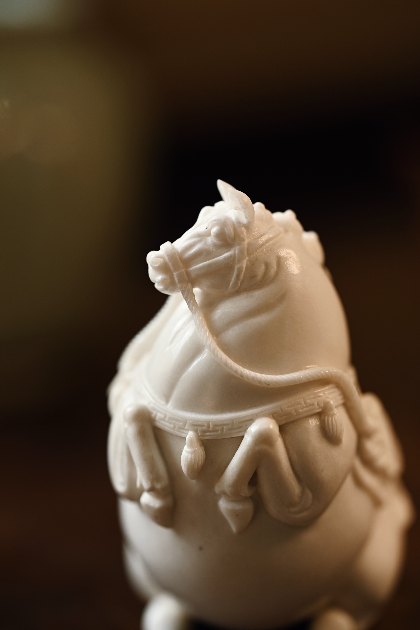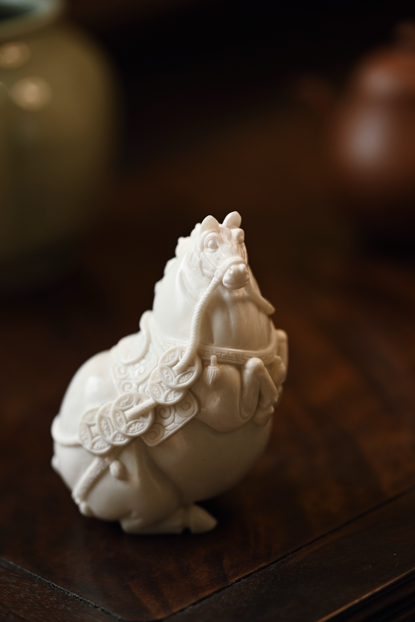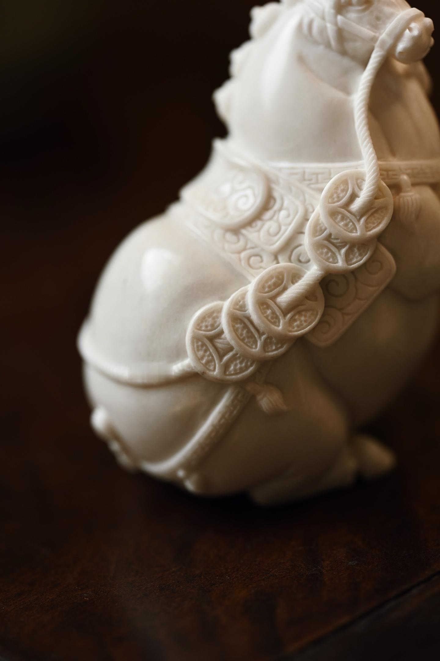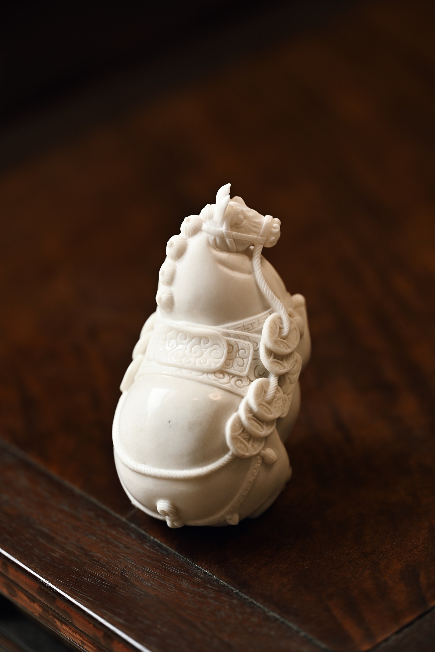 鹿角 | 马上有钱取材质密凝润,圆雕饱满结实,塑形写神颇具气势,骏马立姿,背驼铜钱,立形达意,祝颂“马上有钱”。6.5*4.8*8cm 173g