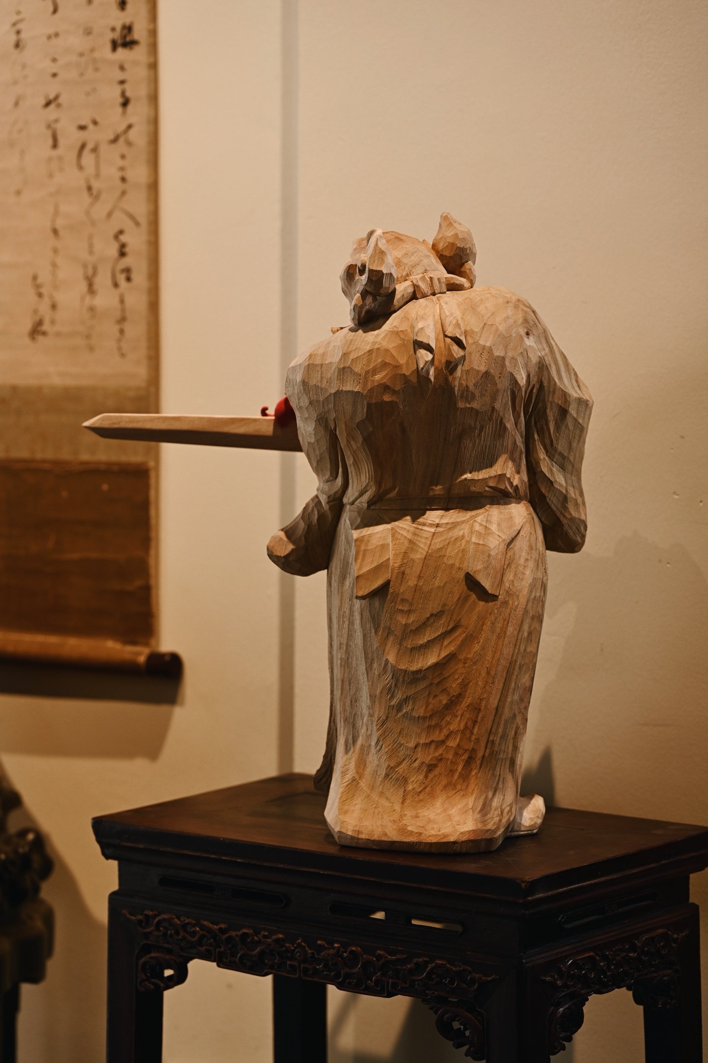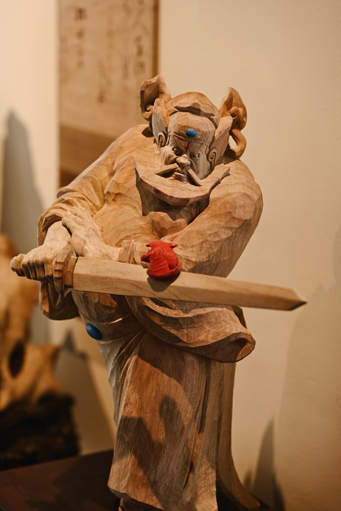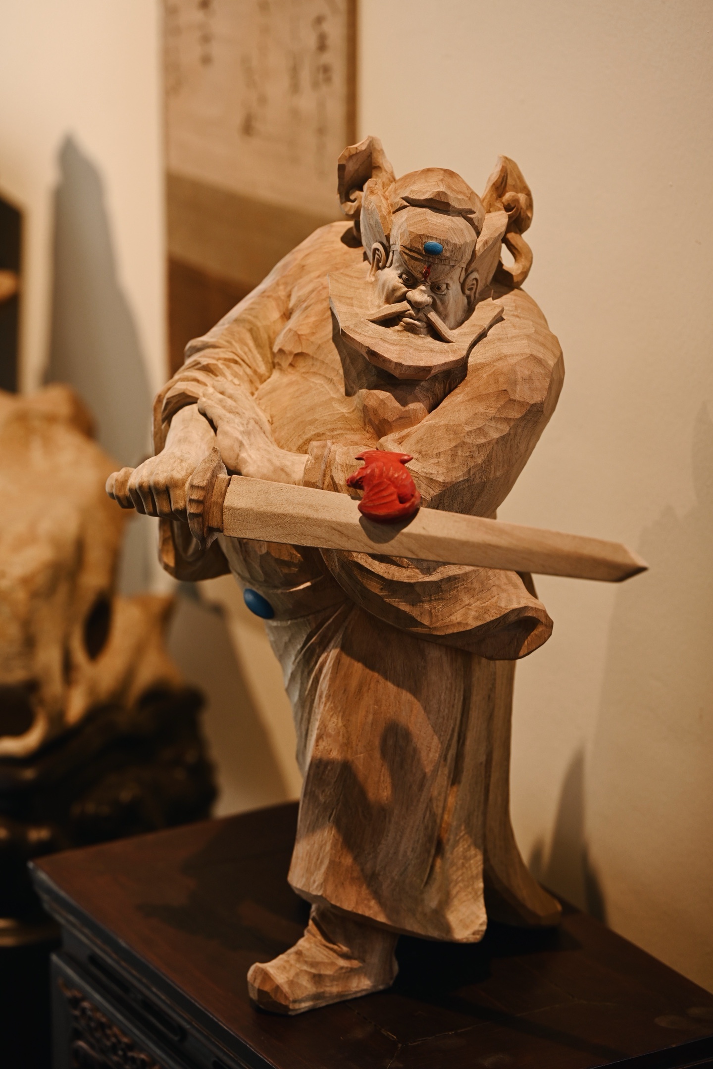 香樟木 | 钟馗木中藏正气,刀下显神威。钟馗不怒自威,衣纹飘逸流畅,手持宝剑,瑞蝠呈祥,摆于书房案几,镇宅纳福。25*24*49cm 6380g 剑长37cm