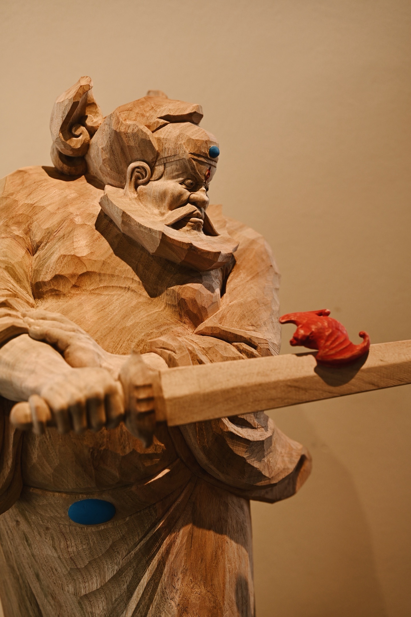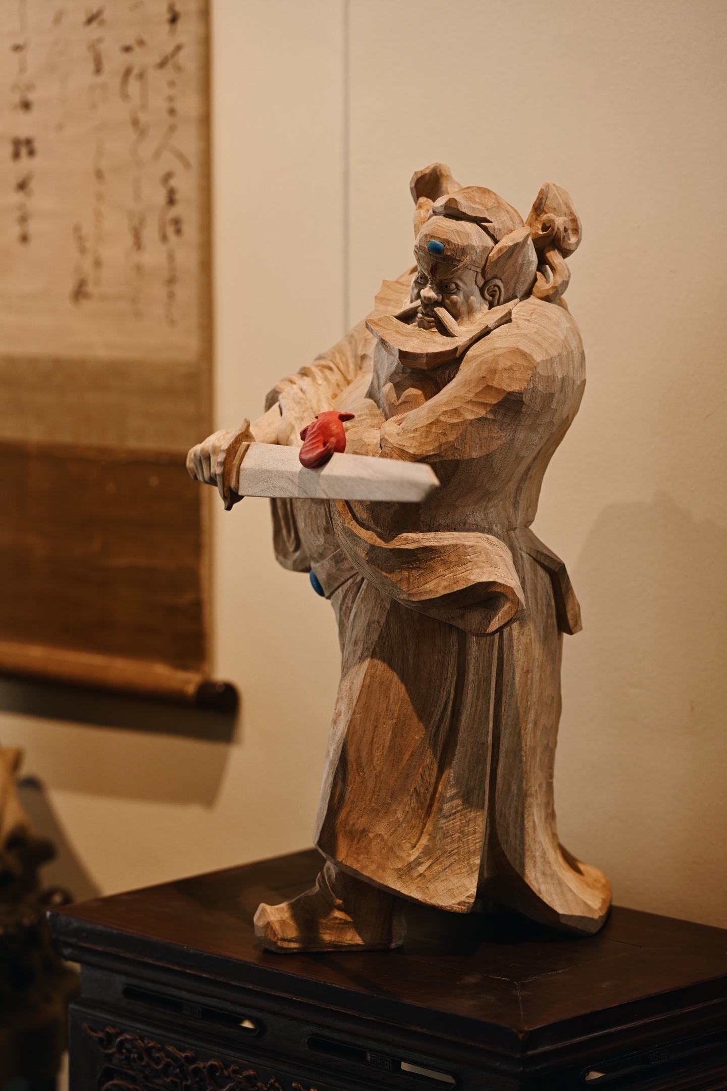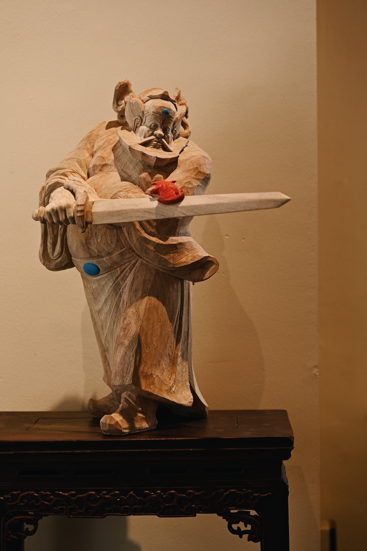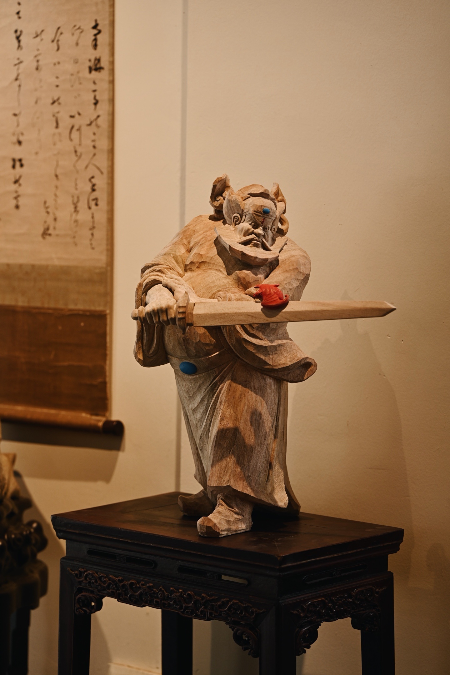 香樟木 | 钟馗木中藏正气,刀下显神威。钟馗不怒自威,衣纹飘逸流畅,手持宝剑,瑞蝠呈祥,摆于书房案几,镇宅纳福。25*24*49cm 6380g 剑长37cm