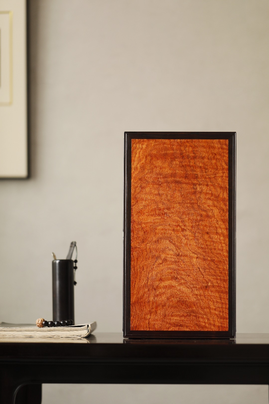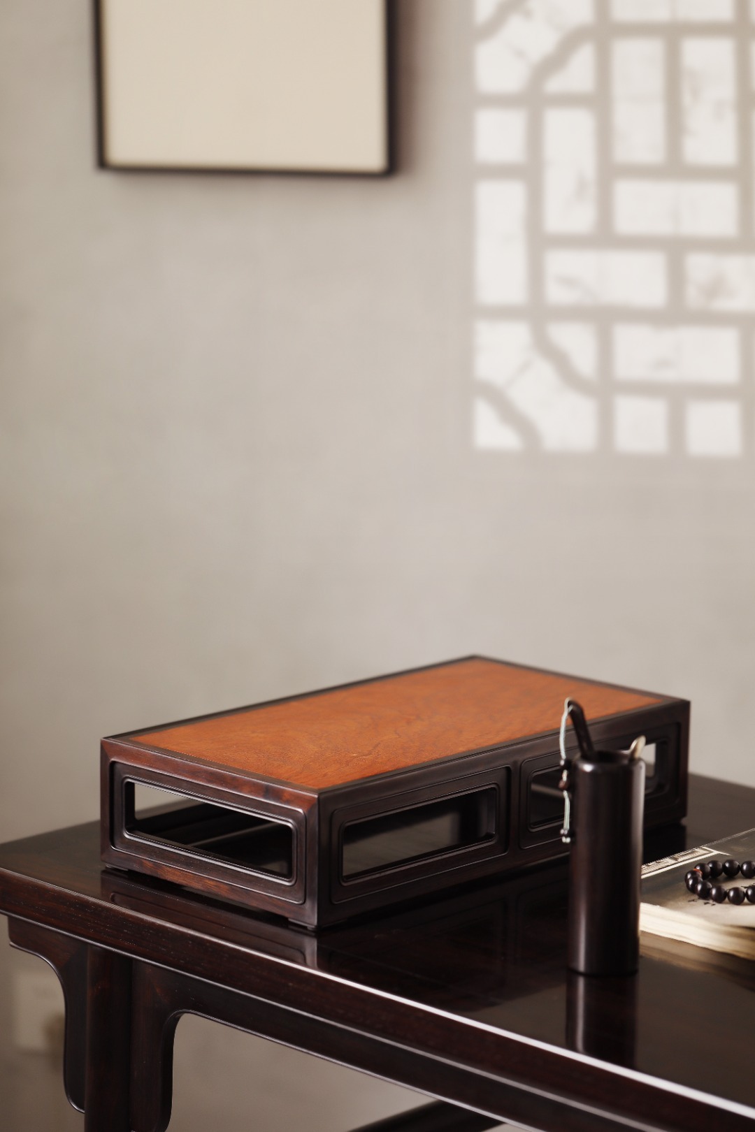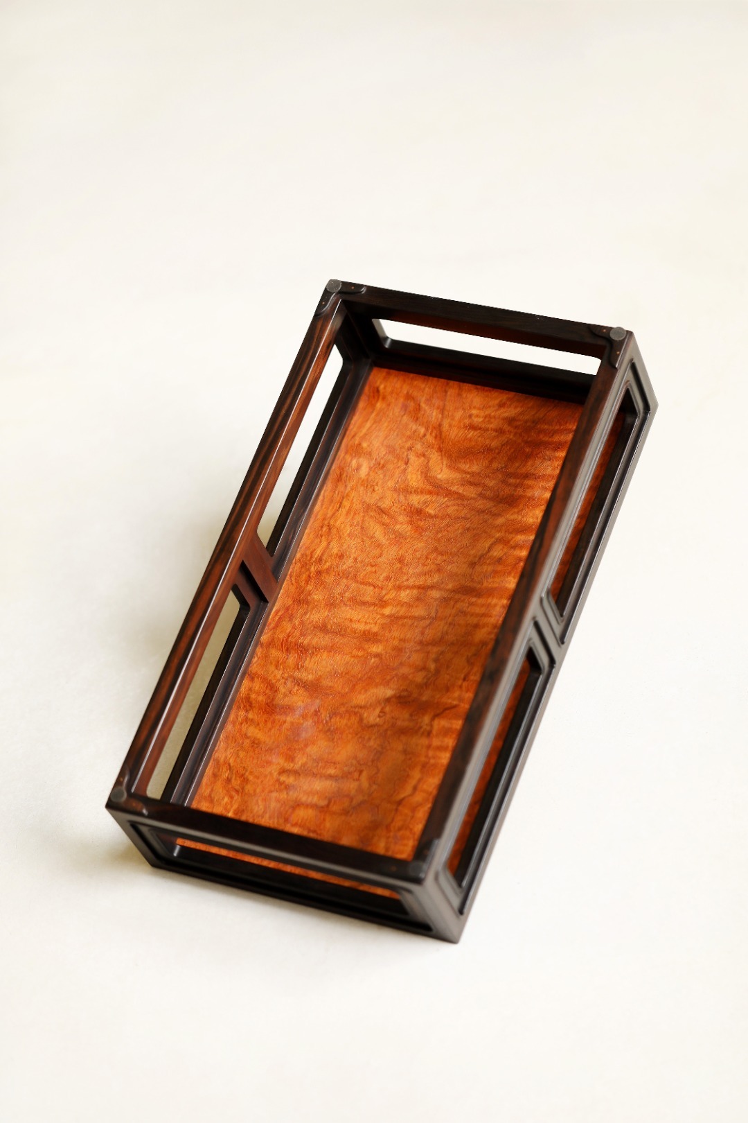 紫光檀x缅花【祥临】香几紫光檀撞色缅花,纹理奇美。纯榫卯,造型端庄婉丽。案上收纳,兼放香器。39.8*21.8*9.3cm 重1335g 紫光檀x缅花【祥临】香几