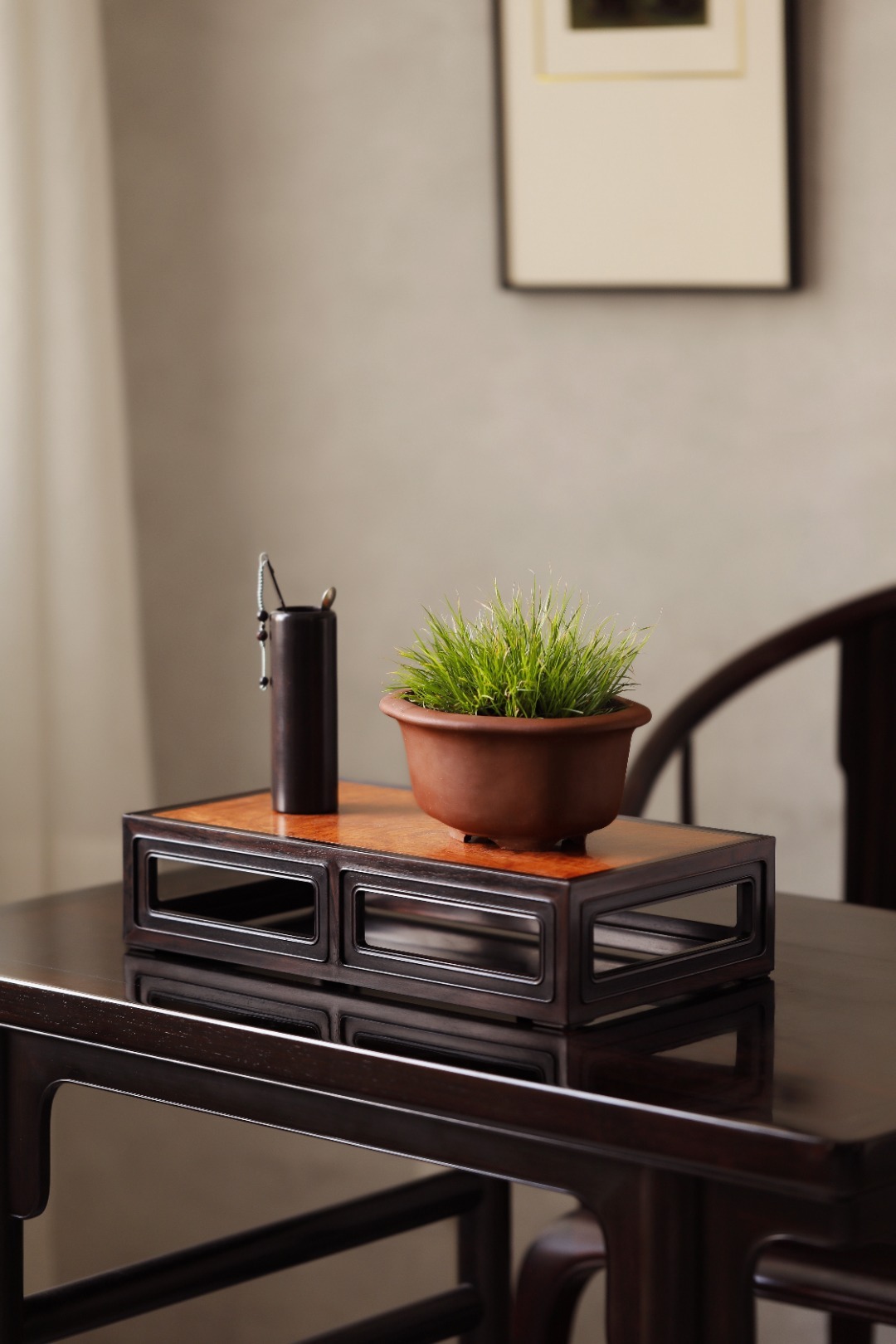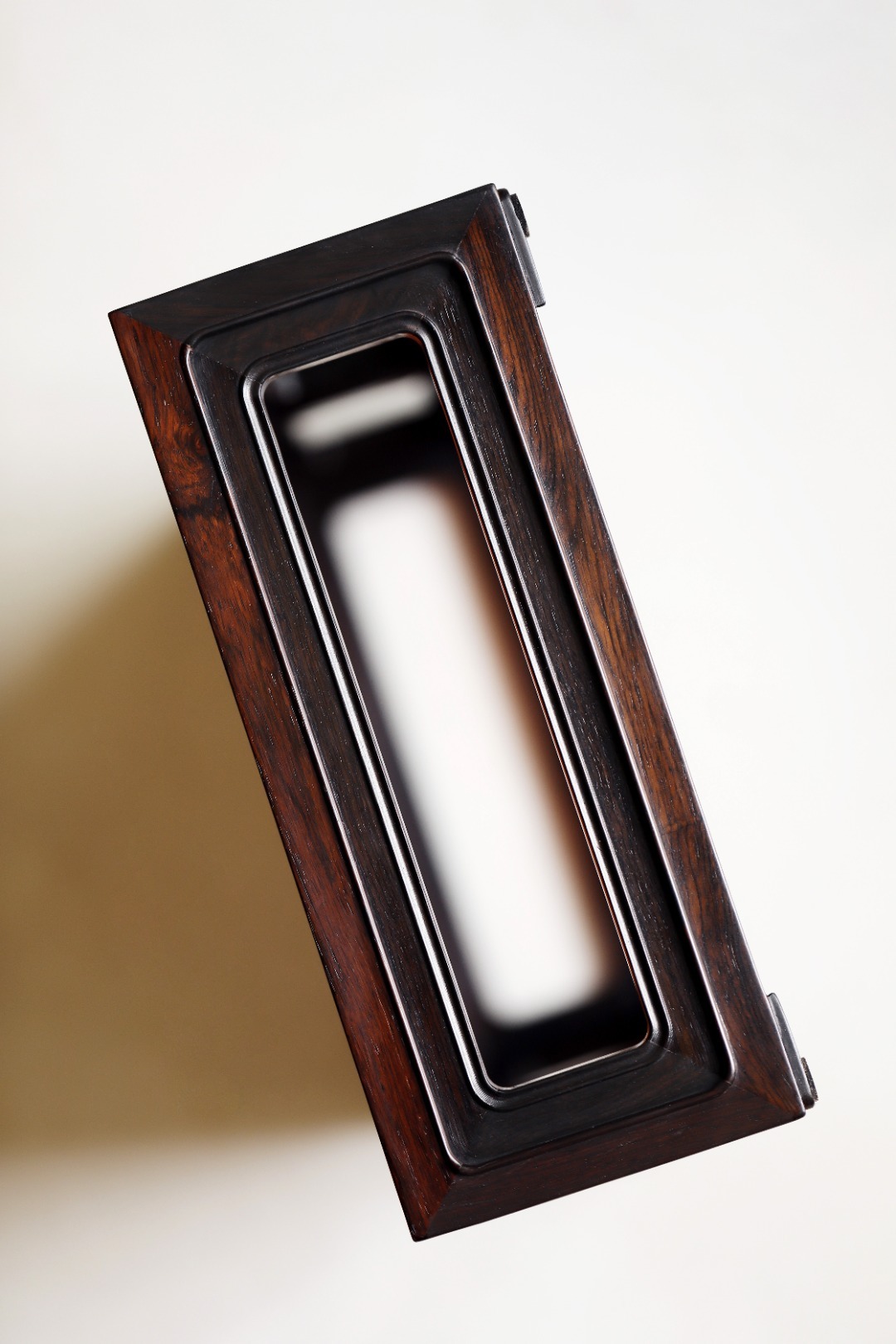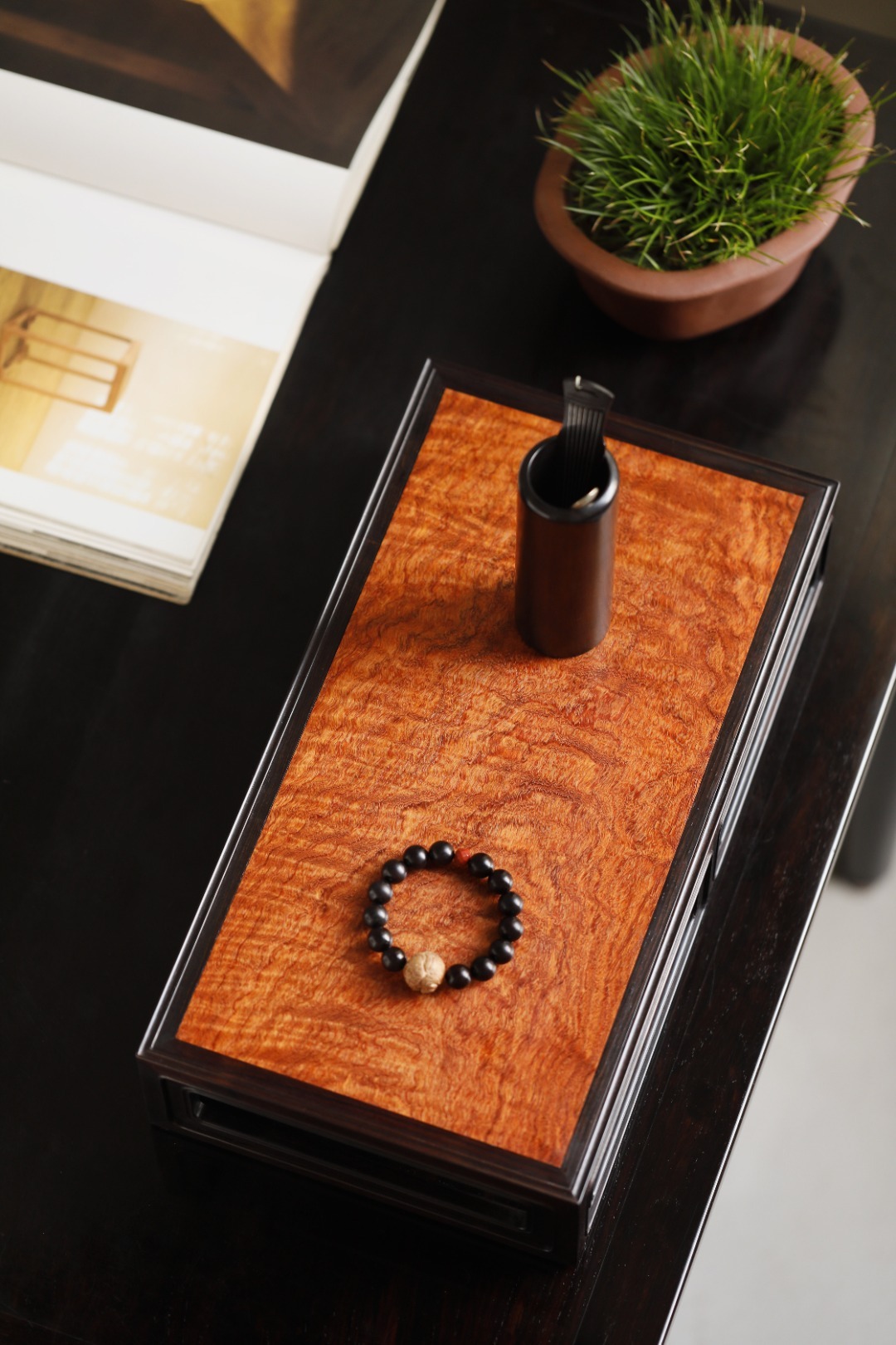 紫光檀x缅花【祥临】香几紫光檀撞色缅花,纹理奇美。纯榫卯,造型端庄婉丽。案上收纳,兼放香器。39.8*21.8*9.3cm 重1335g 紫光檀x缅花【祥临】香几