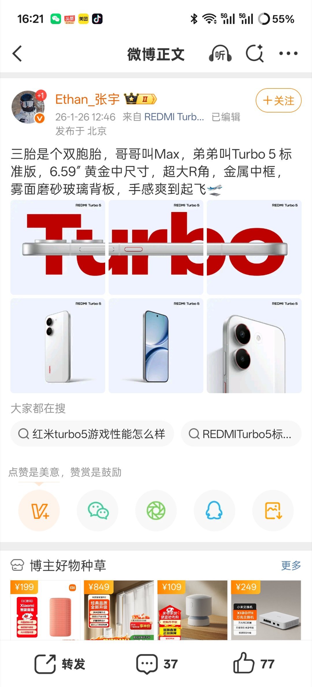 【这次没 Pro:小米张宇透露 REDMI Turbo 5 系列共两杯,Max 和标准版】红米 REDMI 手机市场经理张宇今日发文透露,REDMI Turbo 5 系列共两杯,包括 Max 和标准版。其中,标准版采用 6.59″ 黄金中尺寸设计,拥有超大 R 角 + 金属中框 + 雾面磨砂玻璃背板,号称“手感爽到起飞”。有网友询问今年的 REDMI Turbo 5 Max 是否就是 5 Pro,张宇表示:“就是 Max,这次没 Pro。”小米 REDMI Turbo 5 系列手机已定档 1 月 29 日 19:00 发布,目前 Max 和标准版的外观均已公开。小米张宇透露REDMITurbo5系列共两杯